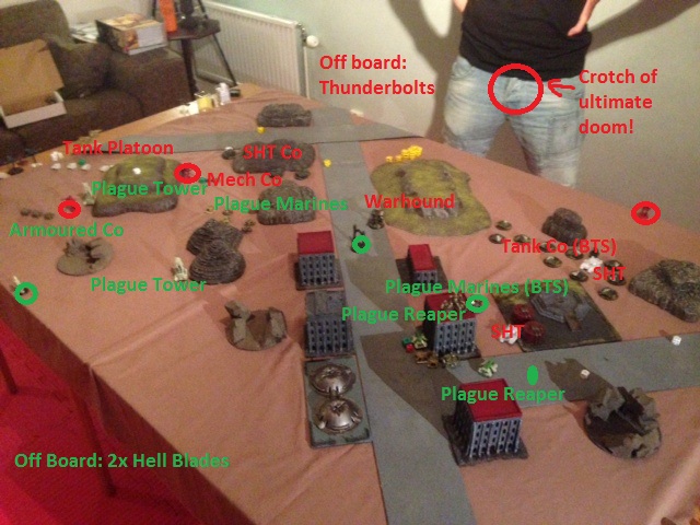 I set my 2 plague towers watching over my blitz and the left flank. The rest of the forces where pretty evenly spread out.