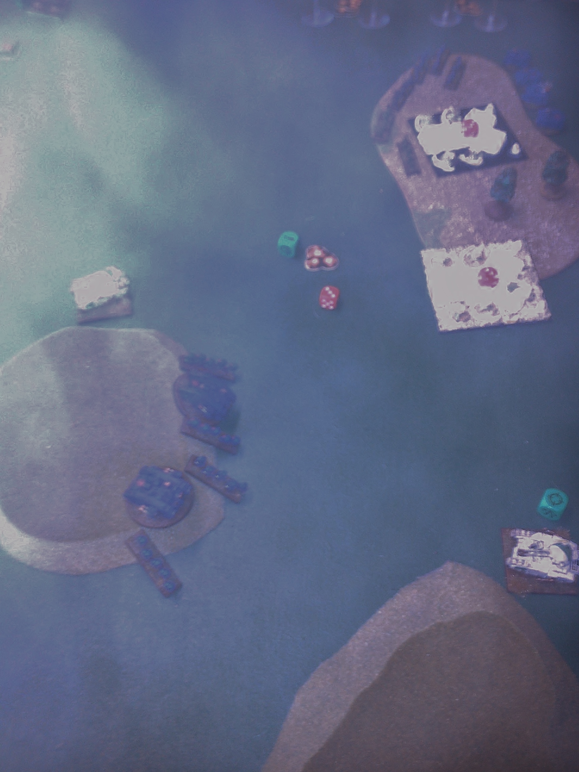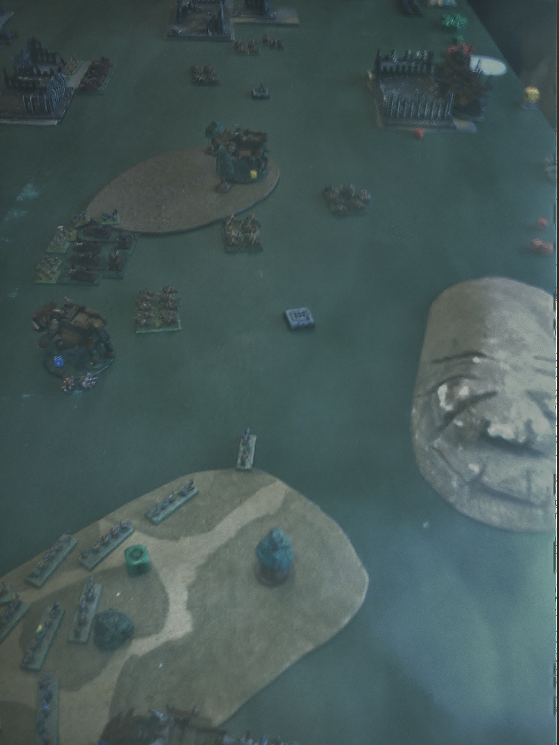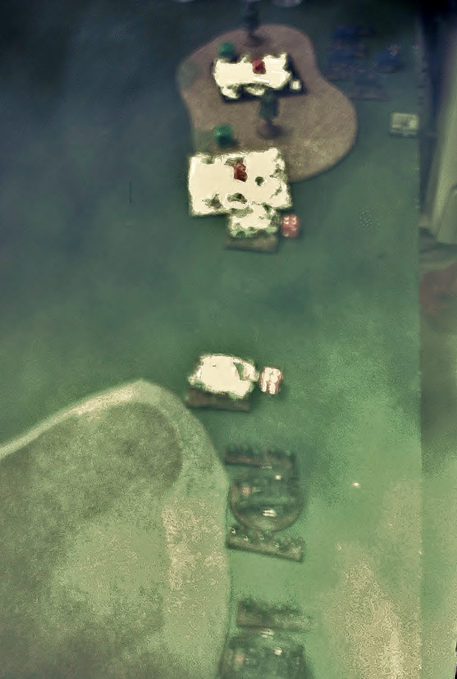 Turn 3 IF wins initiative IF-Centurion, Double (1 DC 2 BM Orkesurrus) IF-Tactical, Engage (3 Tactical & 2 Rhino die, 2 Warband die 2 BM, broken Tactical retreat into Bastion) FO-Boarboys, Engage (no hits but die from support) FO-Warband, Engage (1 Centurion & 1 Crusader die, 2 Warband die 2 BM, broken Centurion retreat behind woods lose 1 from combat) IF-Fellblade, Advance (1 DC 2 BM on Orkesurrus) IF-Fellblade, Fail (remove 2 BM) FO-Warband, Double (kill 2 tactical, broken Tactical retreat behind ruins) IF-Bastion Sustain Fire (2 DC, broken Warband retreat) IF-Scout, March FO-Warband, Double (1 BM on Scout) FO-Boarboys, Engage (kill 2 scout, 1 Boarboy support kill 2 Scout & 1 Rhino, destroying formation) IF-Thunderbolt, Ground Attack (Kill Boarboy 2 BM, 1 kill from AA) FO-Madboys, Double IF-Thunderbolt, Ground Attack (Kill Madboy 2 BM) FO-Big Boarboys, Double FO-Steam Gargant, Double (1 BM Scout)