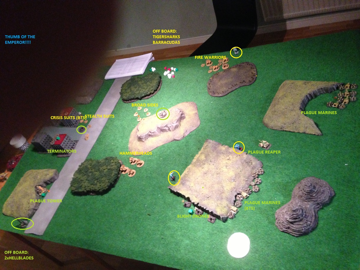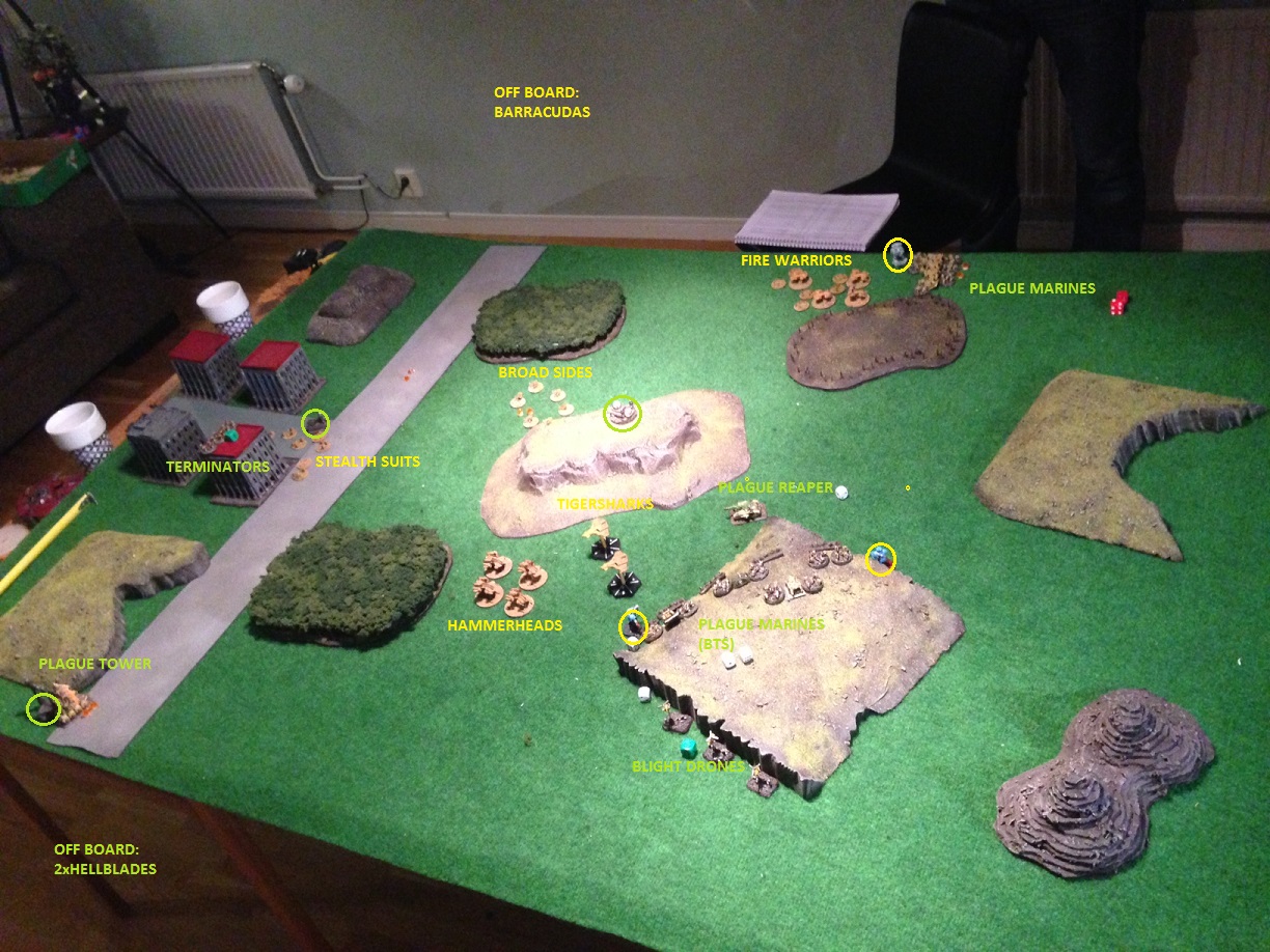 D: terminators summon 5 demons and engages the fire warriors, they also choose to intermingle the crisis suits that are close by. The terminators wins the combat and wipes out the fire warriors completly. They loose 1 terminator stand and 1 demon stand. D: plague marines on right flank retains initiative, summons 4 demons and engages hammerheads in front of them. They use the SC for this. The tanks are wiped out for no Deathguard losses. T: tigersharks ground attack plague tower by Death guard blitz destroying it. T: stealth suits retain initiative and sustains on terminators. No kills are made but the disrupt hits breaks the formation. D: plague tower doubles towards blitz and fires on broadsides for 2BM. T: Barracudas ground attacks plague marines on righ flank for 1 BM. D: the 3 brave plague zombies engages hammerheads and wins the combat by 2! Father Nurgle is very pleased! T: fire warriors advance to the Tau blitz and wipes out the plague zombies in a hail of pulsar fire. D: hellblades ground atatck te broken criis suits on the left flank, killing 5 stands. T: broadsides sustain on plague tower by blitz for 1BM. D: hellblades stand down. D: plague marines (BTS) holds and regroups, shedding all BM:s. D: plague reaper marches towards centre of the board.