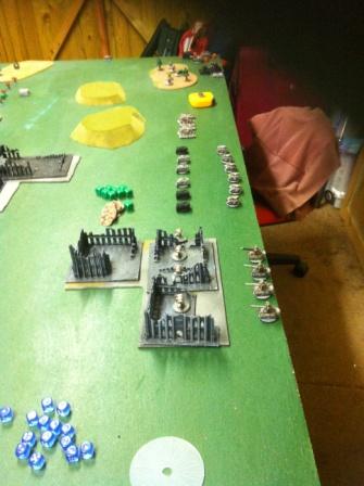 I recon I made several mistakes, firstly we played sides rather than corners. This would have force the IW to bunch up more. Then I placed the spacecraft template too far away from my main drop (only 20cm, but too much with where the IW garrisoned). Finally on the initial errors, I dropped two formations forward, the Death Company & an Assault formation.