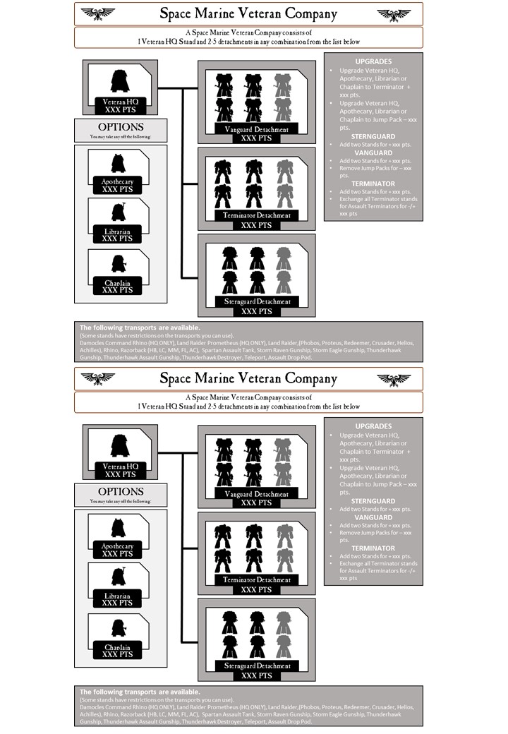 Page 4, under Company Options you have "Replace any Vanguard Veteran Stand with a Vanguard Veteran (On Foot) Stand at a saving of xxx pts per stand". Why would replacing a thing with the exact same thing save any points? Also should remove the bit where it says "at a savings of..." as that is covered by the next column (assuming it will show a negative value).