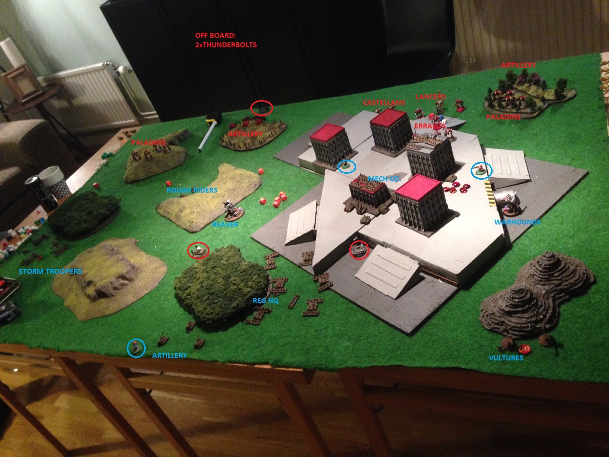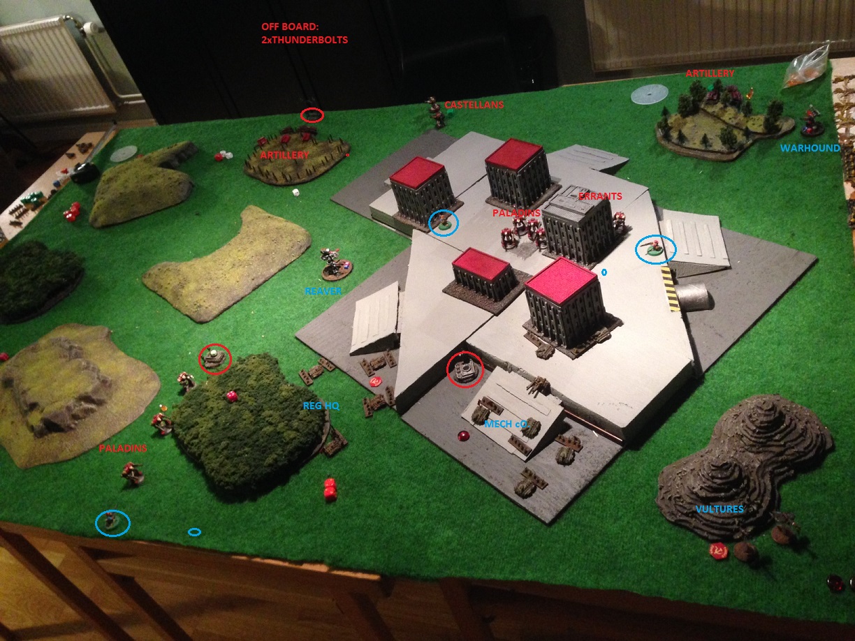 IG: warhound on right flank advances and fires on paladins for 1BM.