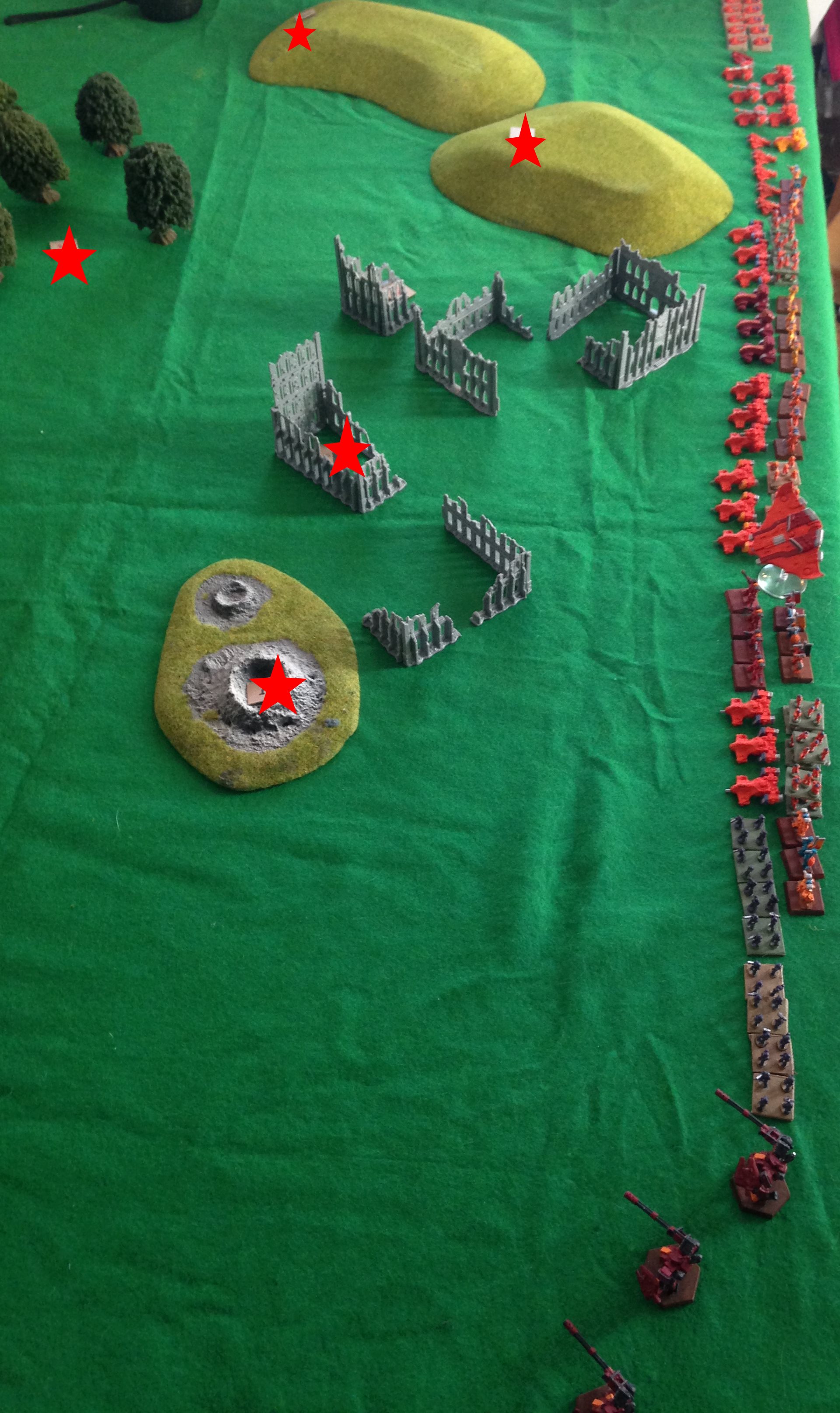 The battlefield had hills at two corners creating a sort of valley running diagonally across the table. At one end of the valley was a small wood, a ruined town and some craters dominated the other end of the valley. The objective points were sprinkled across the middle of the table, on the hills, in the craters, in the town and in the woods.