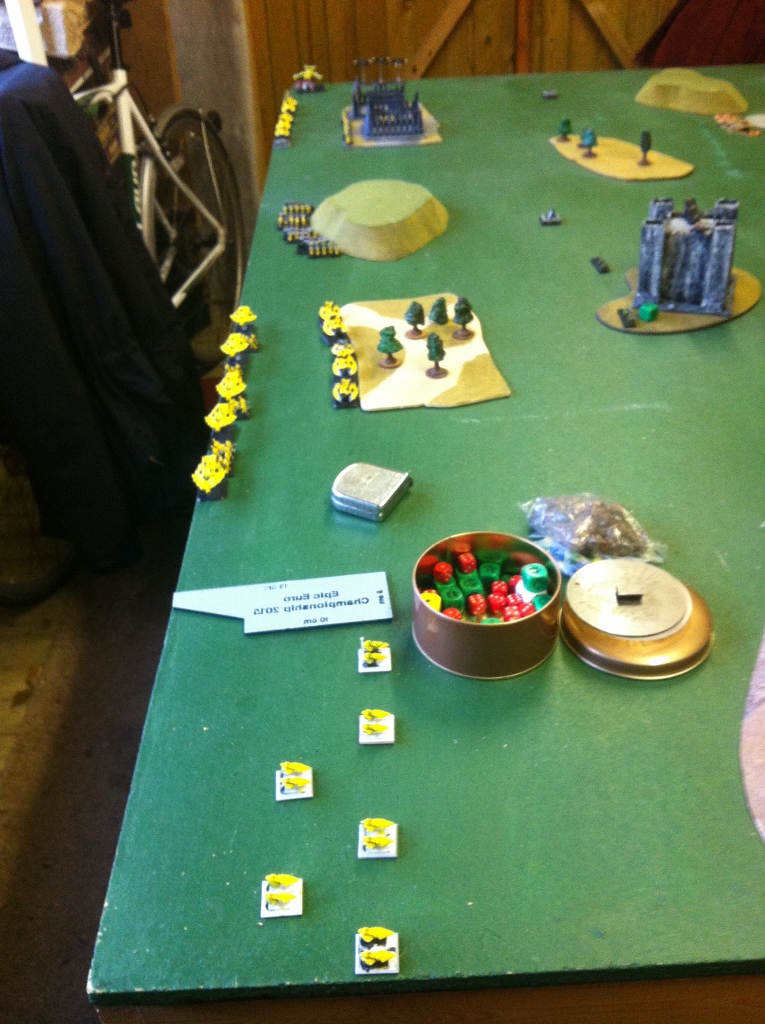 Turn 1 – Iyanden SR 1. Phoenix Bombers ground attack Deathstrikes, 3 hits, no saves formation wiped out. 2. Vampire Raider (with Wraithblades on board) ground attack Manticores 3 hits, no saves formation wiped out. 3. IG – Tank Company advance – fail, take BM and move forward 4. Wraithguard (SC) on blitz go onto Overwatch 5. IG – Warhound doubles forward and fired on Rangers (Mega Bolter only) all miss 1 BM placed 6. Mech Wraithguard double forward behind cover. 7. IG – RegHQ double forward and infantry take cover in ruins. 8. Windriders advance to behind a hill 9. IG – Mech Comp double forward and infantry take cover in woods. Shoot Rangers and place a BM 10. Rangers Regroup – fail & remove all BM 11. IG – Thunderbolts intercept Vampire Raider cause a wound and 2 BM. 12. SoV double forward and shoot Tank Company, 3 hits all saved – 1 BM 13. IG – Sentinels double forward but lose 1 from Difficult Terrain Test. 14. SoV double forward and shoot Mech Comp, 4 AT hits 1 dead Chimera, 2 BM. 15. IG – Hydras go onto Overwatch and wait for the Iyanden Fliers to fly over them. 16. Mech Wraithguard (BTS) double forward and sideways 17. IG – Warhound doubles forward and shoots SoV misses with everything including Plasmas 1 BM Fly offs – 4 hits on Phoenix Bombers – 2 die 4 hits on Vampire Raider – 1 further wound destroys aircraft & Wraithblades 1 hit on Thunderbolts 1 dead.