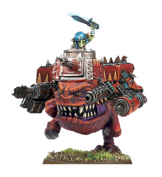 Interesting picture. That could work too. Adjusting the War Squig's stats slightly: more armor so 3+ save, weapons as per Onslaughter Dreadnought, and remove Rampage (as it is at least marginally controlled and not fully wild), cost would be 85 for a formation of four models, BP 2/4. [Note that formula based costs are ONLY valid when all players are using Points Formula values for their armies. They might work with normal Gold costs, but probably will not.]