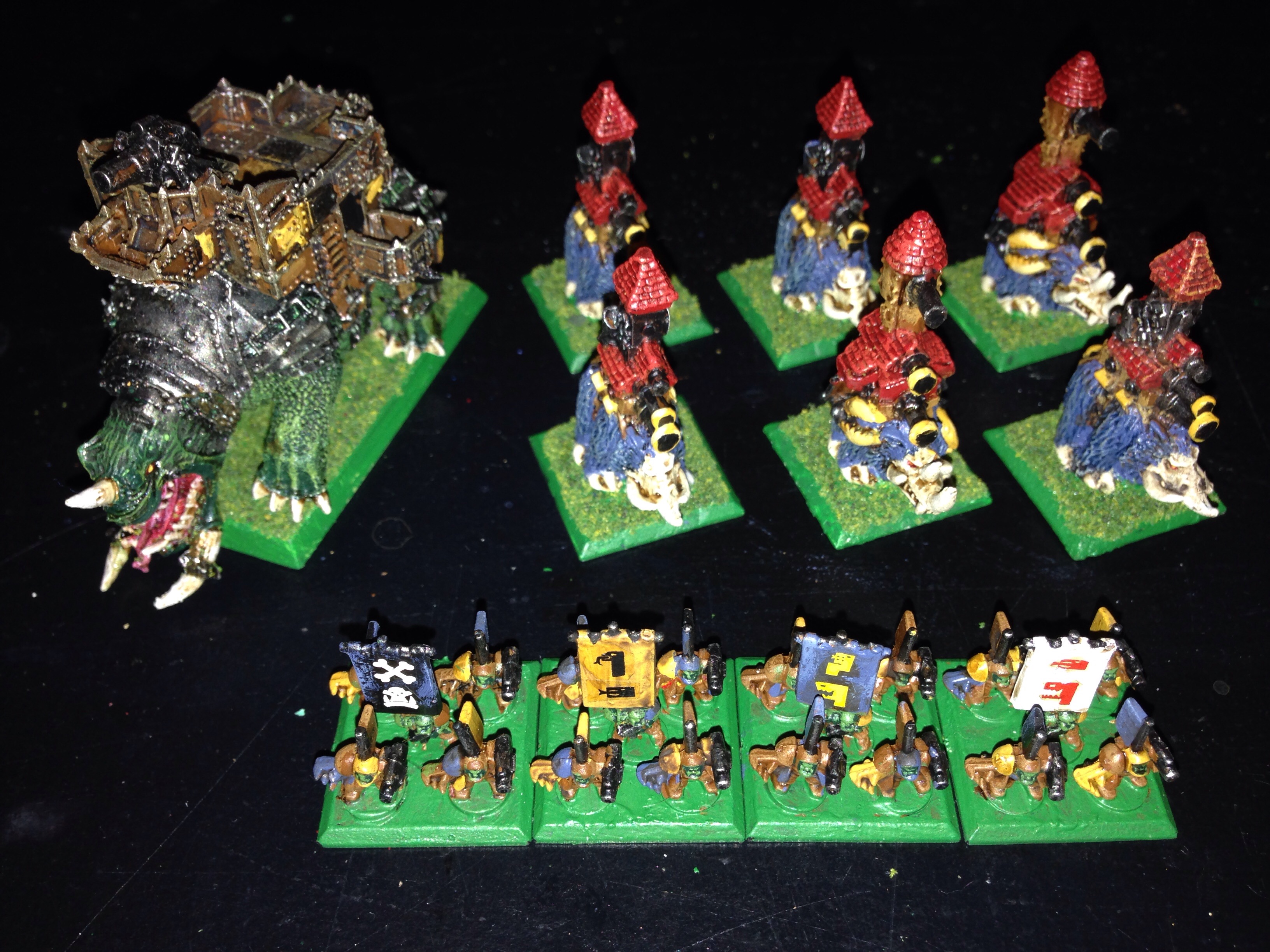 I've also painted up the war squigs which I think should be comprised of 5 stands. I'm going to field test a few rule variations. I've included a photo with the 5 models and a nob stand for size comparison. To the right is my scratch built armoured war squig, kind of a replacement dreadnought so would be only 4 stands in a detachment. Let me know what you think.