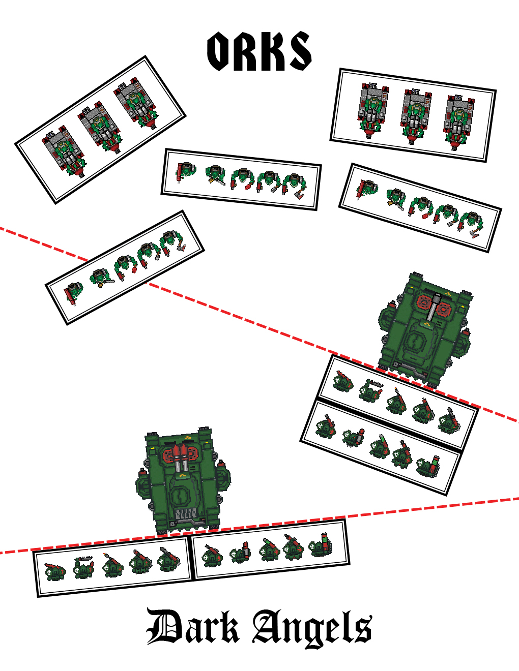 Note the two possible ways to arrange infantry units behind vehicles. The "broad" formation for the second Dark Angels squad is particularly appropriate for square-based infantry (although either could be used in that case as well). Also, note that the E40k rules normally consider a multi-model based unit to be within a distance, under a template or behind a line if at least half of the individual figurines on the base are. In this case, the Dark Angels player just gave the Orks the benefit of the doubt. What friendly sportsmanship!