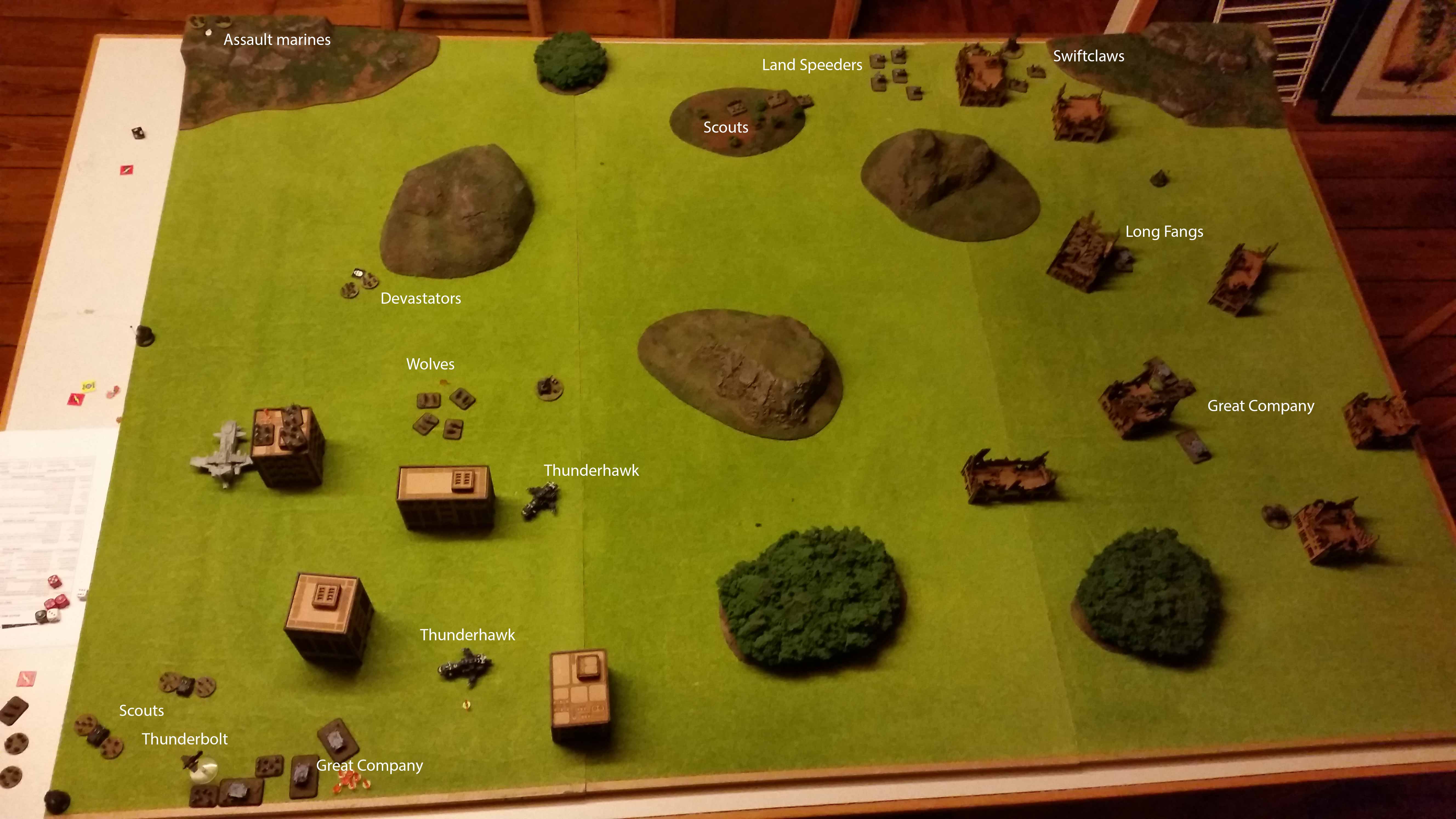 The main army would just charge head on and hope for the best. The Terminators would strike against the blitz or against a titan if able. Long Fangs started in OW a bit forward in the field, trying to discourage airassaults.