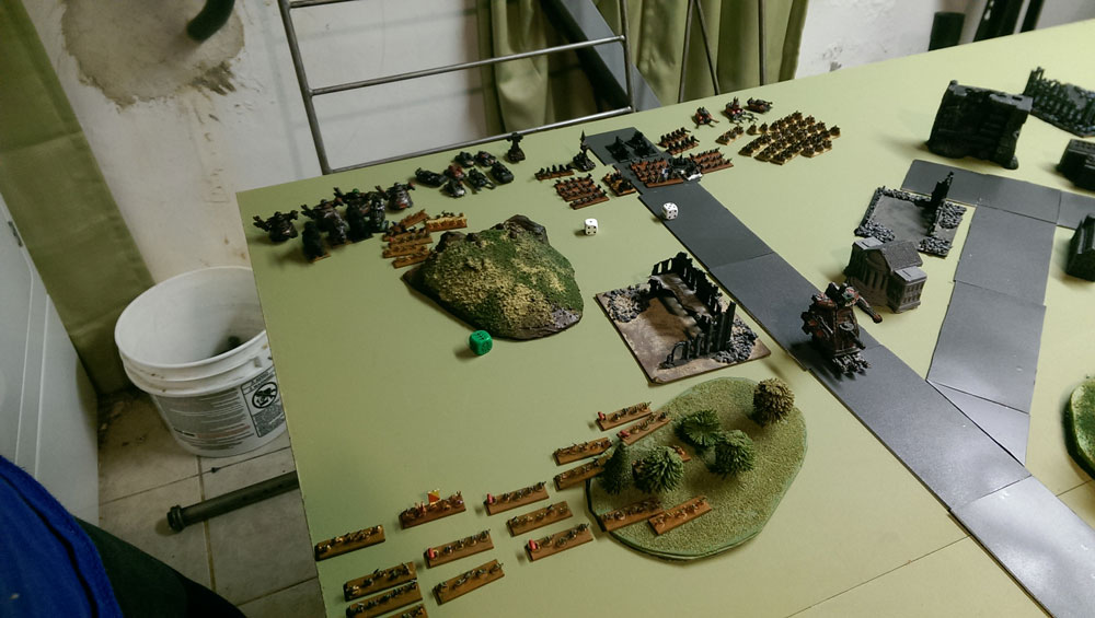 I believe this was a 1500 point game with myself playing the unstoppable orks surging forward to overwhelm the pitiful humans who stood in our way.