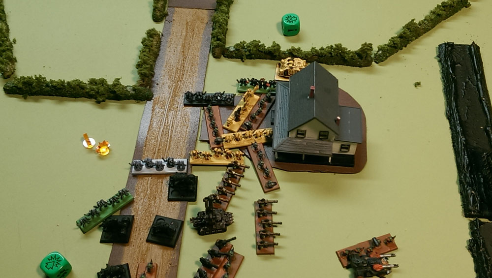 File comment: His assault troops revealed their hiding place in one of the bocages and leapt to assault my boarboyz after the Whirlwinds pounded them. The orks won, but at a cost and drove the assault troops back.