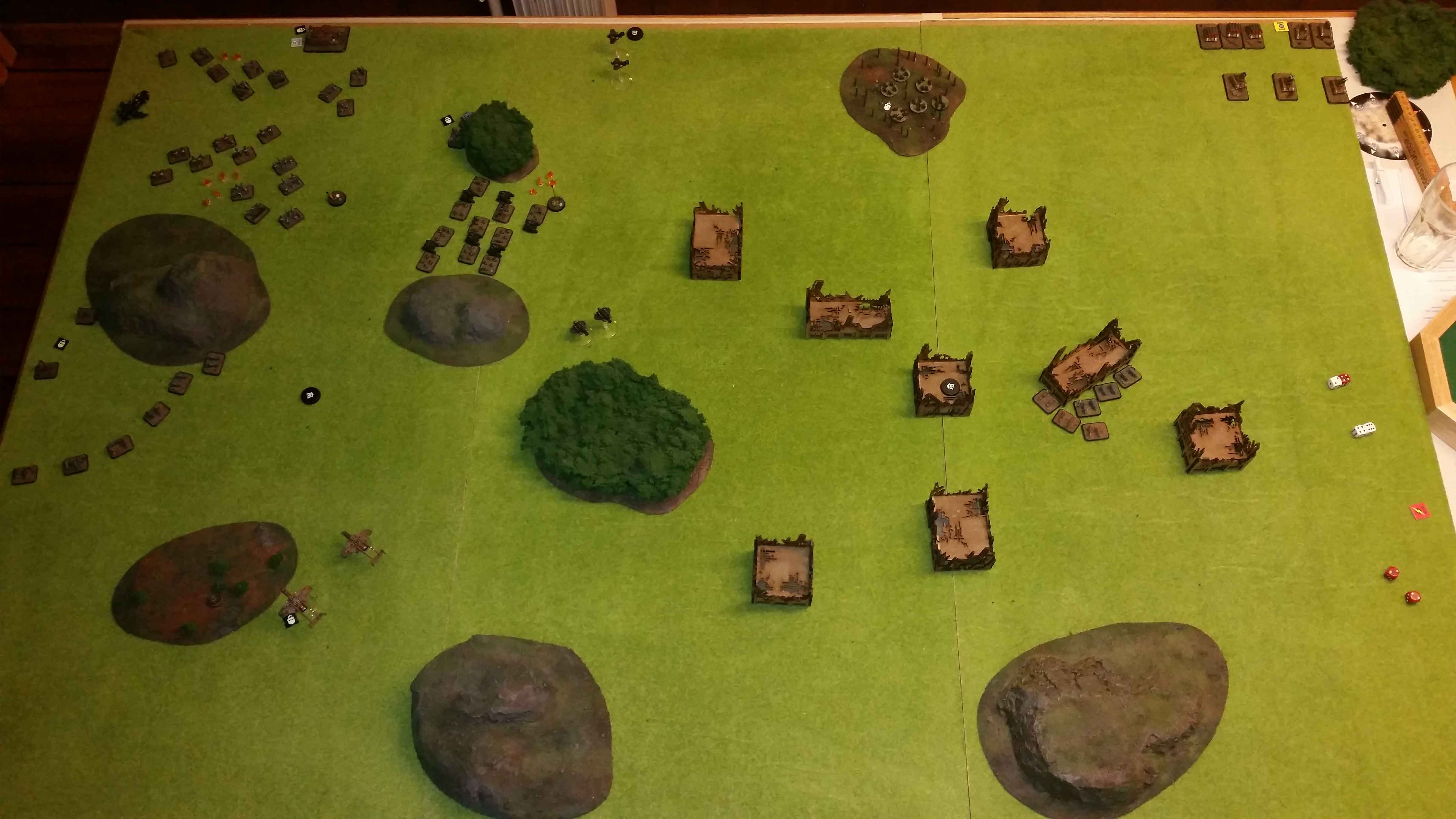 The Guards answered by killing three Terminators, amongst them the Wolf Lord, with the Shadowswords and then bombard the Great Company with the Manticores. The rest of the turn was just some movement while the Wolves out activated the now badly hurt Guards waiting for the HQ and Hydras to activate before sending in the air assaults. In the end I tried an all-out attack sending one Thunderhawk against the Super heavies and another against the activated HQ. The attack on the Super Heavies was succesfull after another close result before roll-off. Leaving a single running Commissar tank with one DC. The attack on the HQ with the Skyclaws failed and four battered Skyclaws fled to a nearby ruin after only killing three Gurdsmen…