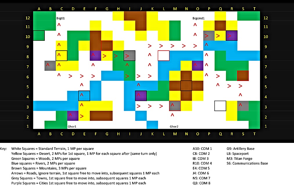 Campaign Map with Campaign Objective Markers (COMs) (squares ringed with black borders) plus Mission Objectives (squares ringed with red borders).
