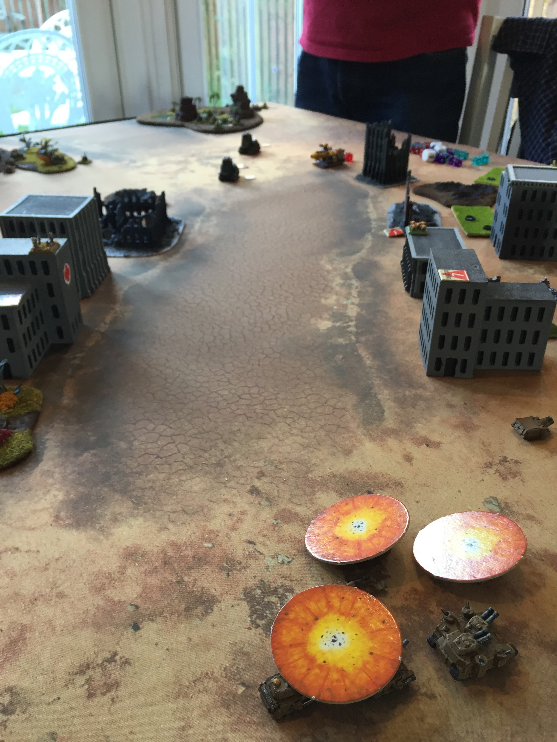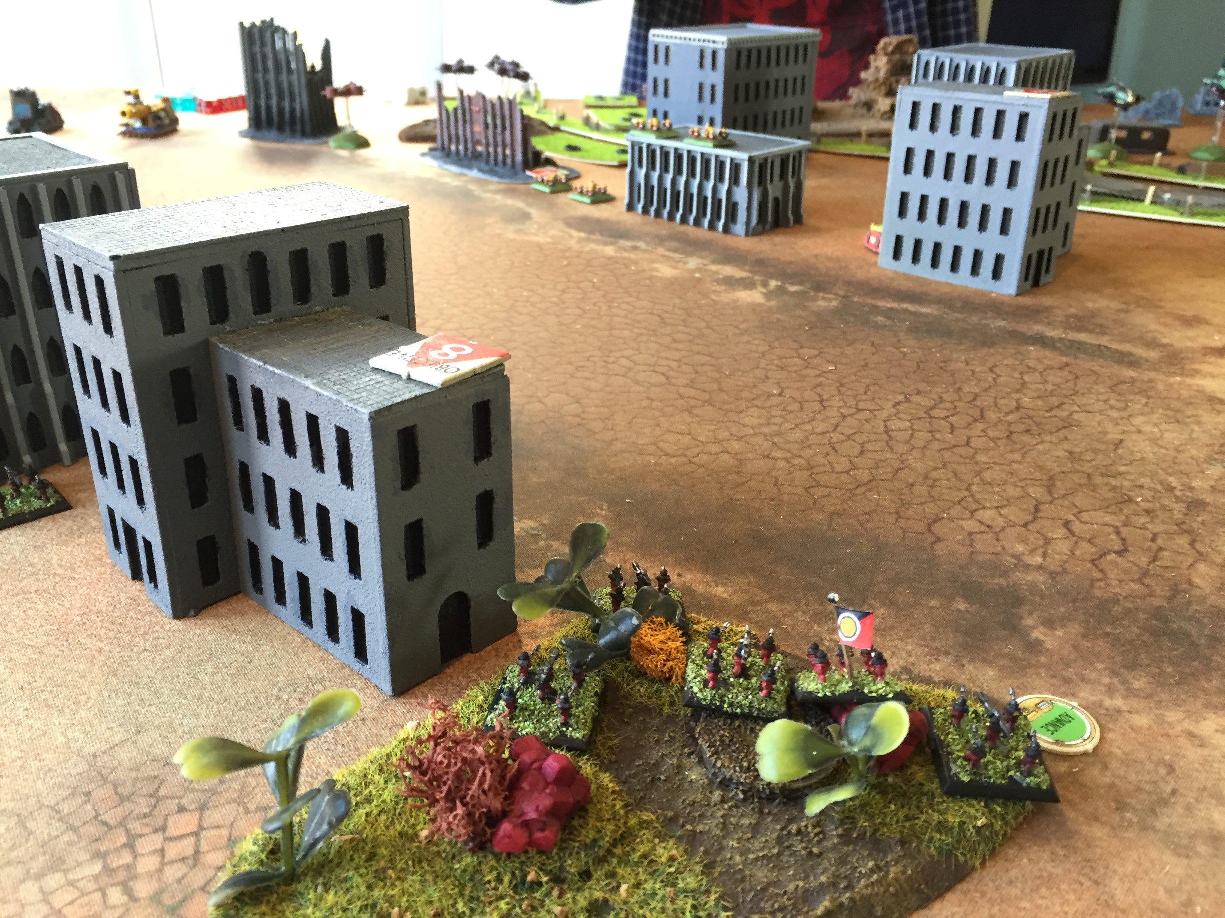 Imperial heavy troops spot the squat infantry moving in the buildings opposite them and fire from the tree line, eviscerating 3 units.