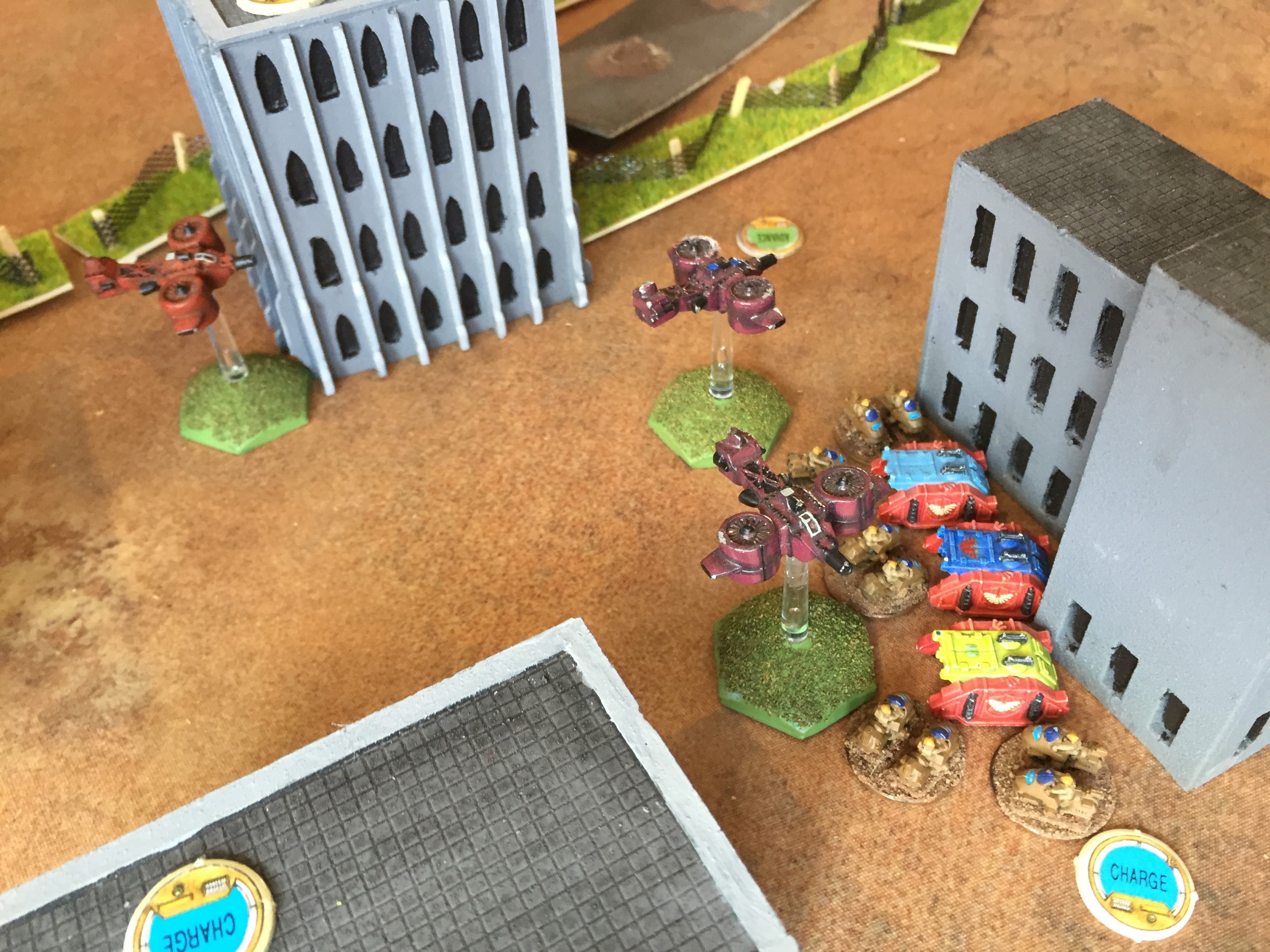 overhead a detachment of gyrocopters dart between the tall buildings and begin firing at a squad of heavy infantry making a break for higher ground, one unit is gunned down.