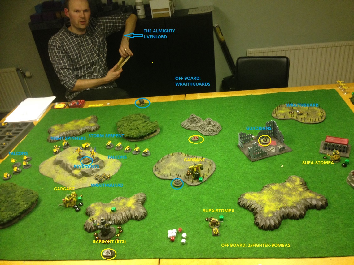 UvenLords abyssmal rolling was what won me the game to be honest. He rolled very few hits when shooting my gargants and i saved alot of the actual hits. Still, both my BTS-Garagnt and the other gargant where down to very few DC:s left (BTS had 3 and other gargant had 2). Had we rolled more close to averege rolls both would have been dead and the game would have dragged to turn 4 for sure.