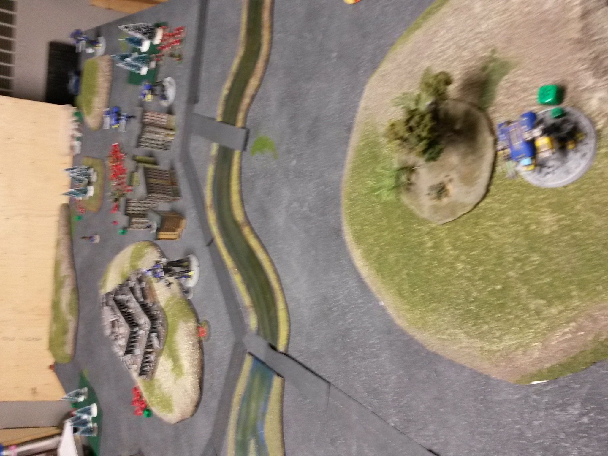 ATML – Warhound #1 Doubles, shoot Scout Troop #2, kill 2, 3 blast Scout Troop #2 Overwatch and down 1 void shield, 1 blast on Warhound #1 Eldar – Sword of Vaul #1 Advance, Pop Up from behind hill, staying 30cm away from Crusader Maniple (to avoid Overwatch) and shoot Warhound #1 and down 1 void shield, 1 blast on Warhound #1 ATML – Reaver #1 doubles and shoots Scout Troupe #2, kills 2, breaks unit. Crusader Mantiple Overwatch shoot Scout Troupe #2 and destroy unit Eldar – Hornets #1 Doubles and shoots Warhound #1, (3 hits, 2 save) 1 DC damage and breaks unit. ATML – Reaver #2 Doubles and shoots Hornets #1 in cover, no hits, 1 blast ATML – RETAIN with Reaver BTS, Double and fail, use SC reroll and base Double, shoot Hornets #1, kill 2, break Hornets Eldar – Hornets #2 Double, shoot Reaver BTS, 4 shields down, 1 blast ATML – Thunderbolts #1 Ground Attack Scouts Troup #1, 1 blast Eldar – Wild Rider SC Double to withing supporting fire of Reaver BTS and shoot Reaver BTS, 1 blast ATML – Warhound #2 Moves and Shoots Wild Rider BTS, kills SC and 2 vypers, 4 blast Eldar - Sword of Vaul #2 Doubles and shoots Reaver BTS, 3 hits 1 DC damage, 2 blast ATML – Thunderbolt #2 Ground Attack, ground AA shoots down one Thunderbold (2 blast), kill 1, 2 blast Eldar – Wild Rider #2 Double (into support fire range of Reaver BTS) and shoot Reaver #2, no hits, 1 blast Eldar – Scout Troupe #1 Fail activiation, Hold and Marshall removing all blast markers Eldar – Wild Rider BTS fail Engage out of Wraithgate, Hold and marshall, removing blast Eldar - Shinning Spears Engage out of Writhgate Reaver BTS, 3 DC on Reaver BTS with the help of Supporting Fire, Reaver BTS Broken, Shinnig Spears take 2 casualties and 2 blast, Reaver #2 takes 1 blast for supporting