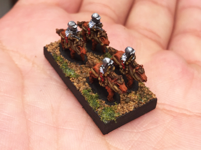 The base proportions are equal to the original Warmaster bases, but scaled down for 6mm scale. I like them better than the huge bases I tried above. They're also, of course, in Imperial units, since I'm in the USA: 1 1/4" x 5/8".