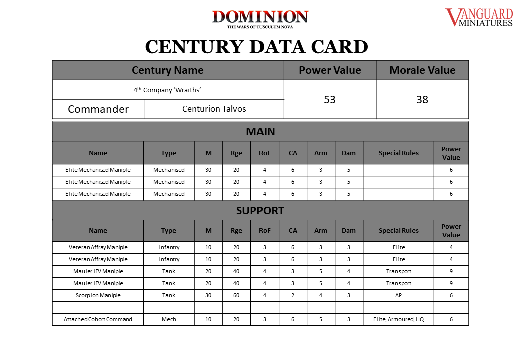 I have also attached a example of a Century which will contribute one activation. As you can see at 300 Power the game will involve many Centuries and is truly mass battle. I've also included a blank to help get you started