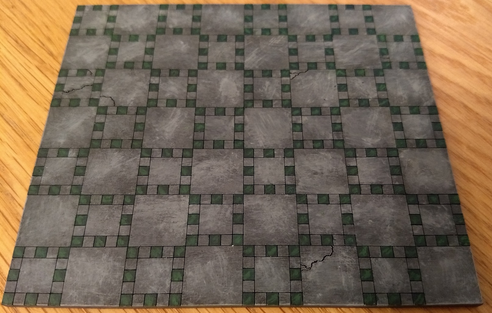 Progress has been slower than hoped due to 'real job'. But here is a painted proto-type of one of the mid-sized rooms. This has less cracked tiles than other rooms as it's supposed to be a more important room like an armoury or hall.