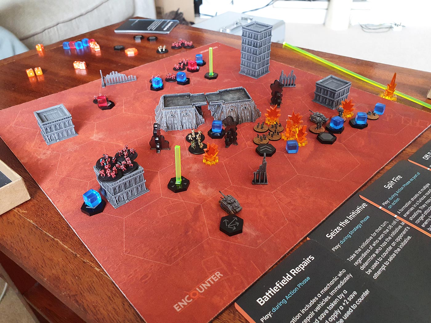 Apoc: wins the initiative but I play a Battlefield Tactics card 'Seize the Initiative' to steal it back. (We each have 5 tactics cards chosen before the game starts). I play another card 'Split Fire' to allow my Supreme Commander to fire his auto-cannon at multiple enemy Heavy weapons troop formations. I use 2 Hero Tokens to guarantee 2 hits, and 2 enemy units die. (We each have a limited number of Hero Tokens, that have various uses.)