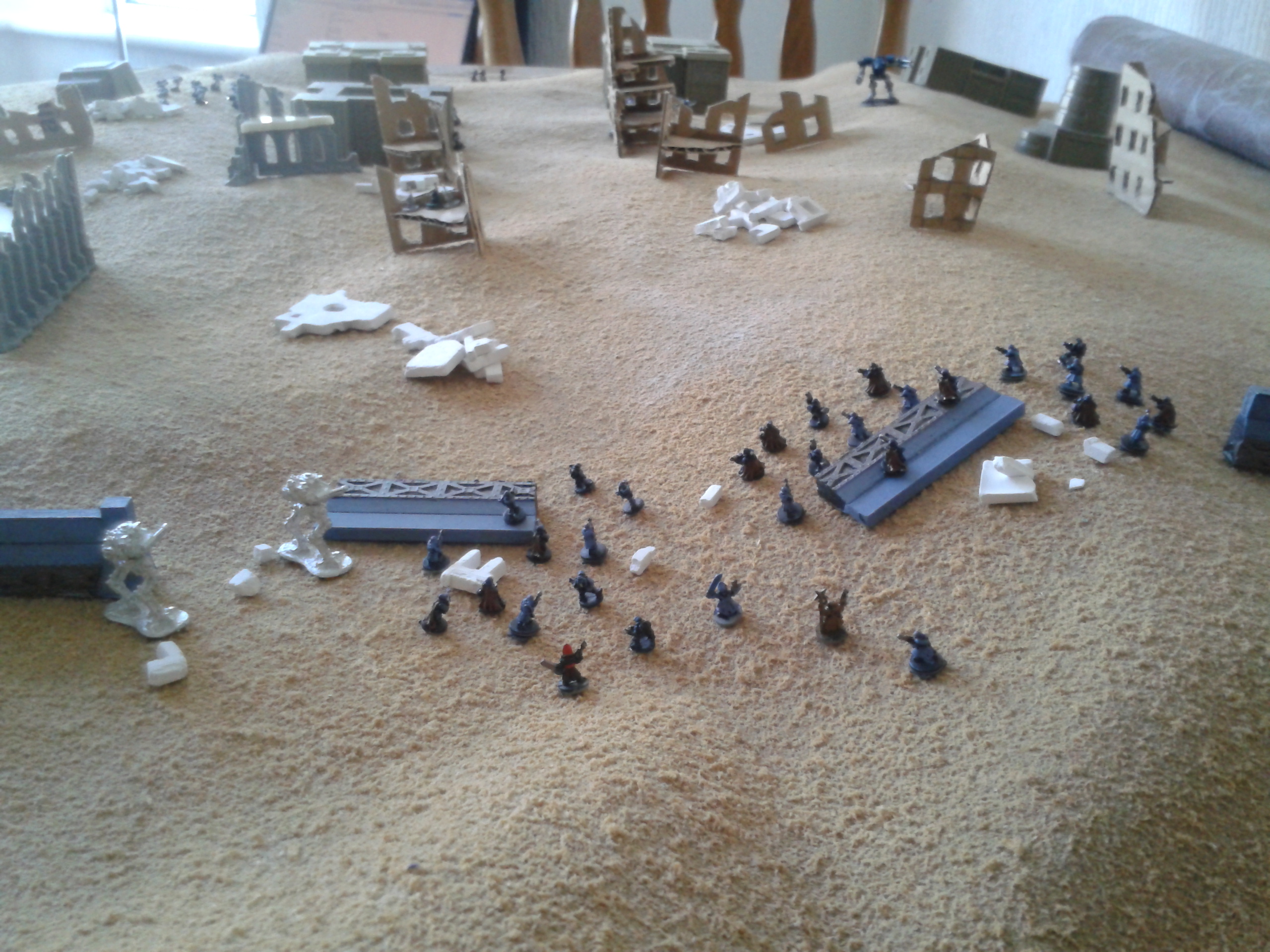 Close call. It looked like the battle would be really one sided - until the Andrayada walkers went down and the basilisks acted more like tanks than artillery. I don't think the board was large enough (100x75cm, with 1cm = 1inch in 28mm scale) for sustained indirect fire. All in all - an eventful game