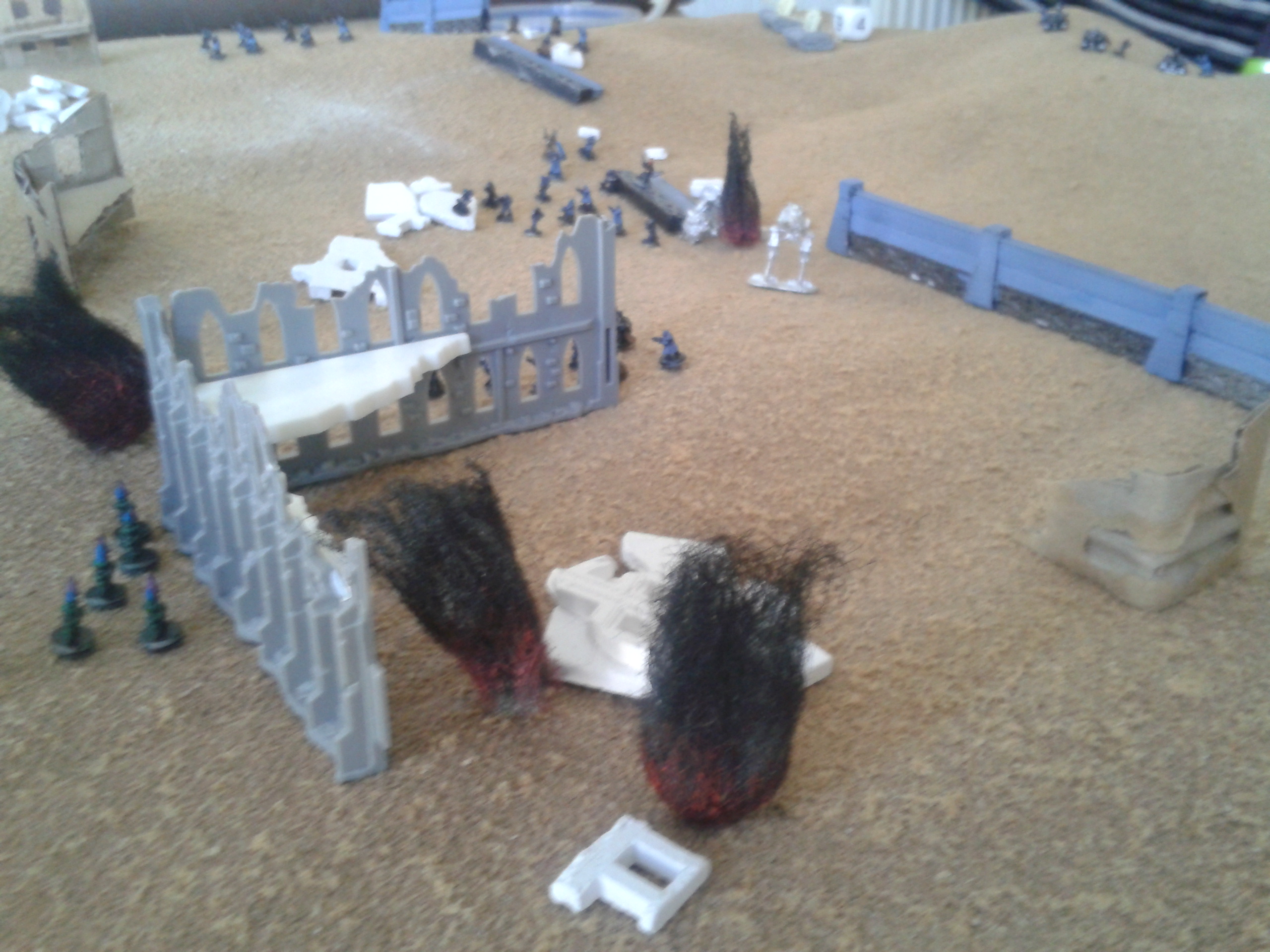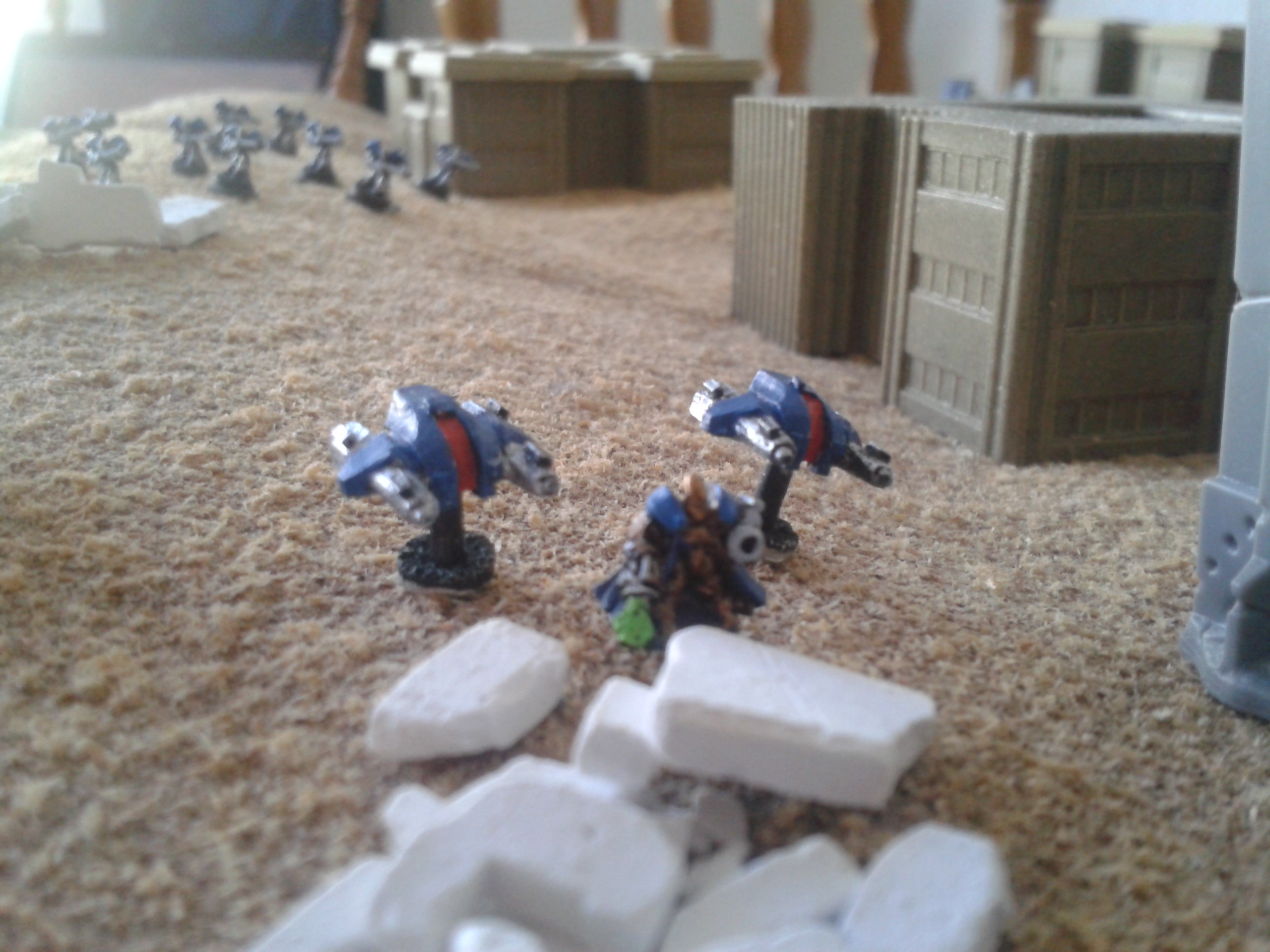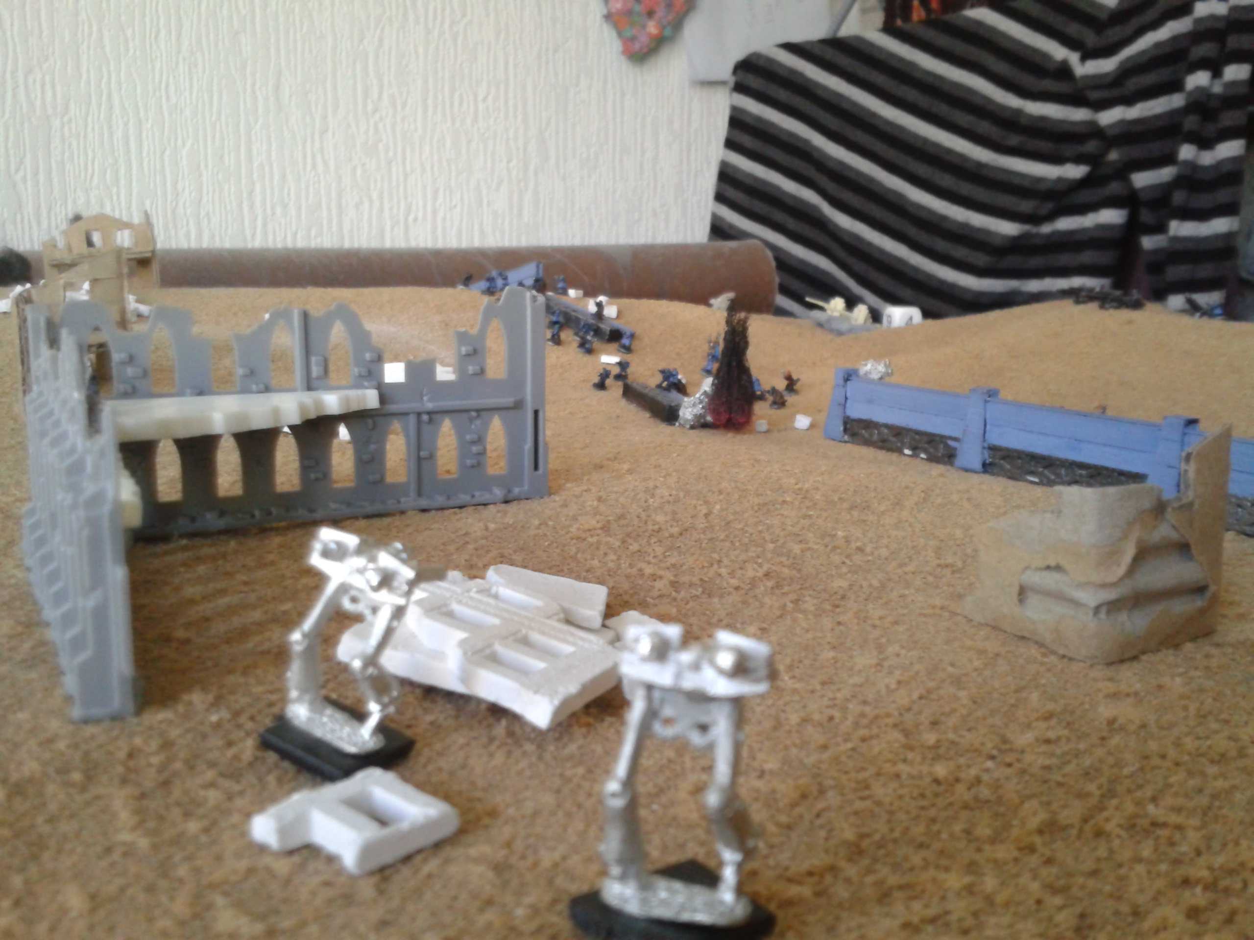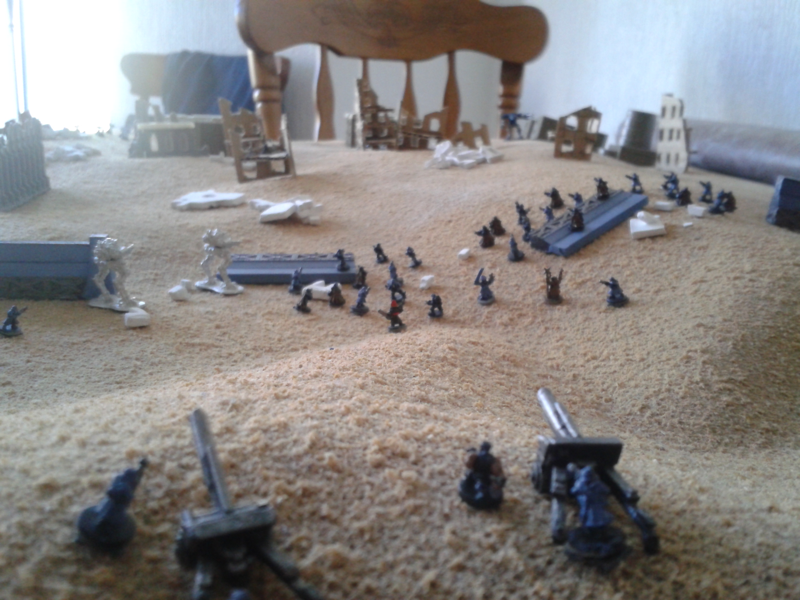 The Basiliks open again, hammering the Mantragan whilst it was distracted with the infantry. The infantry are destroyed in the blast, with the crew's reluctance to follow the friendly fire orders overcome by the presence of the commissar in the nearby command squad. The heavy bolters spray shells into the smoke and dust, with the fire altogether resulting in damage to the ammo feed of the twin-linked autocannon in addition to stabiliser damage. The consequence being that the pilot loses control of the walker. The malfunction soon proves to be less of a concern following the subsequent destruction of the machine after a second barrage.