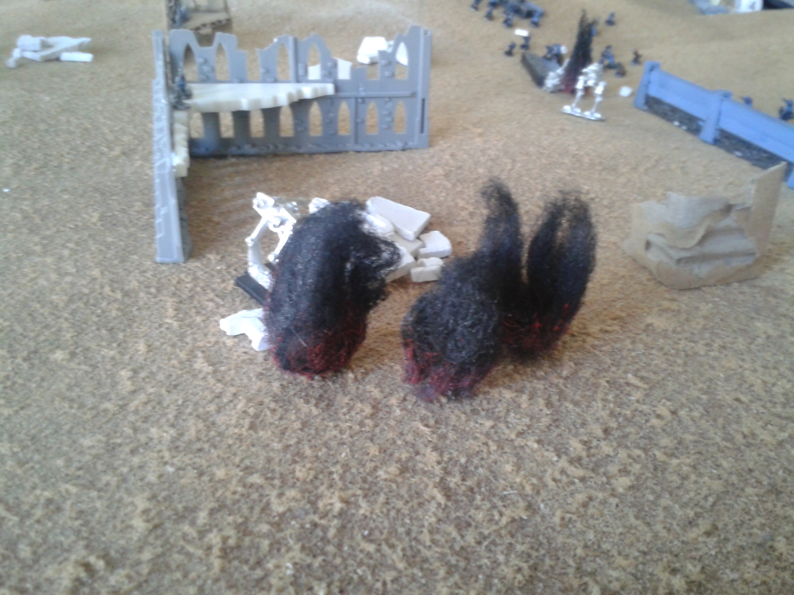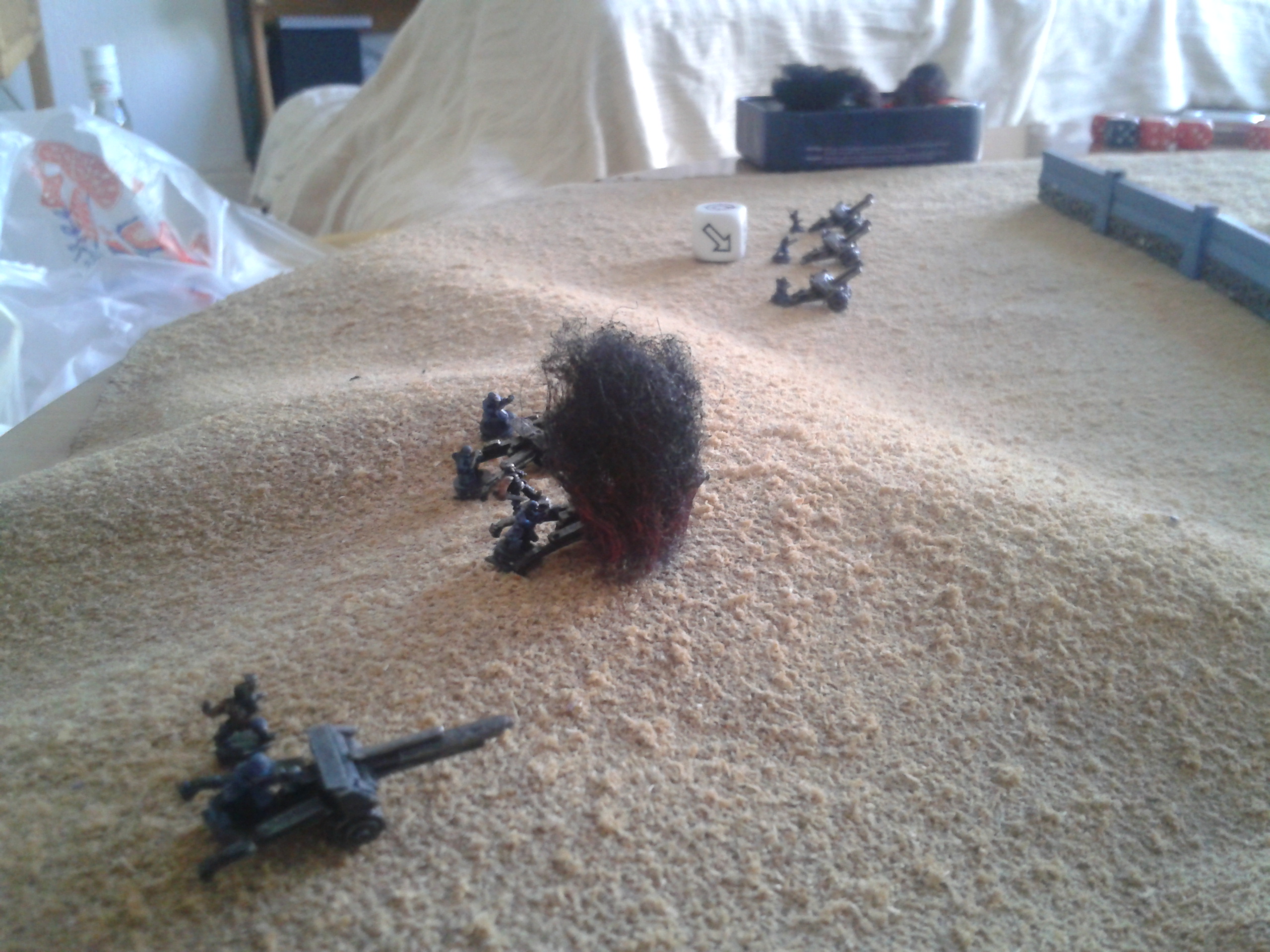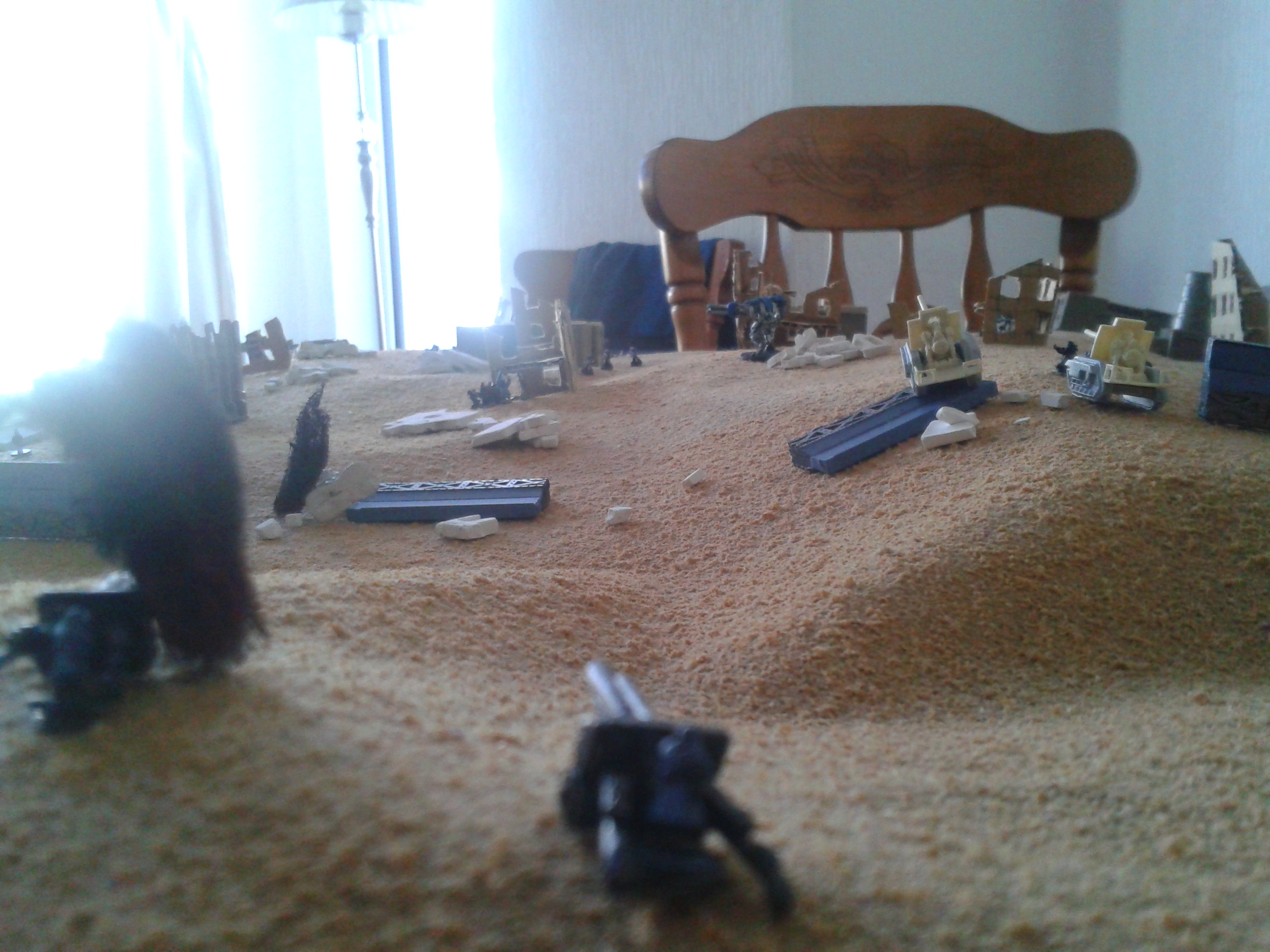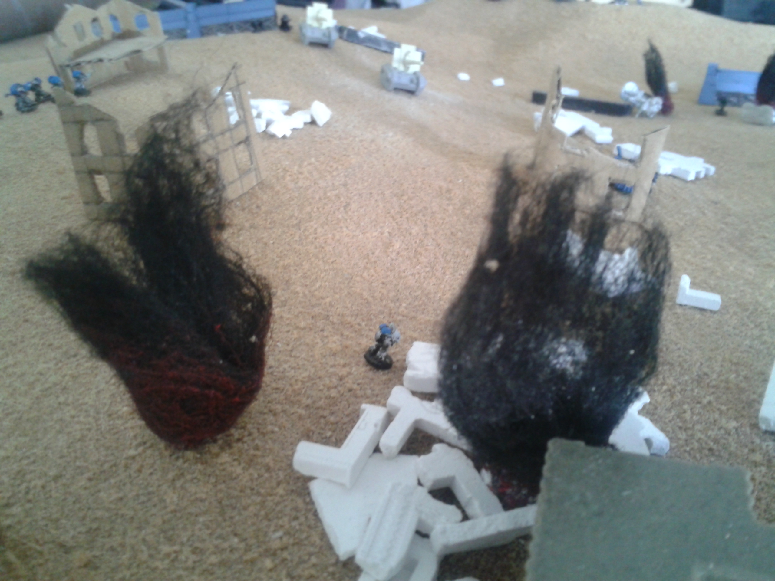 The Basiliks open again, hammering the Mantragan whilst it was distracted with the infantry. The infantry are destroyed in the blast, with the crew's reluctance to follow the friendly fire orders overcome by the presence of the commissar in the nearby command squad. The heavy bolters spray shells into the smoke and dust, with the fire altogether resulting in damage to the ammo feed of the twin-linked autocannon in addition to stabiliser damage. The consequence being that the pilot loses control of the walker. The malfunction soon proves to be less of a concern following the subsequent destruction of the machine after a second barrage.
