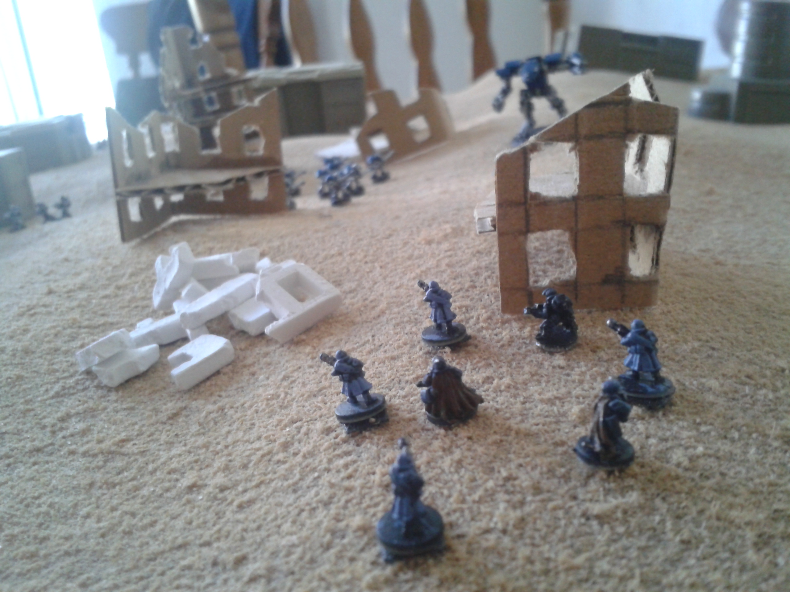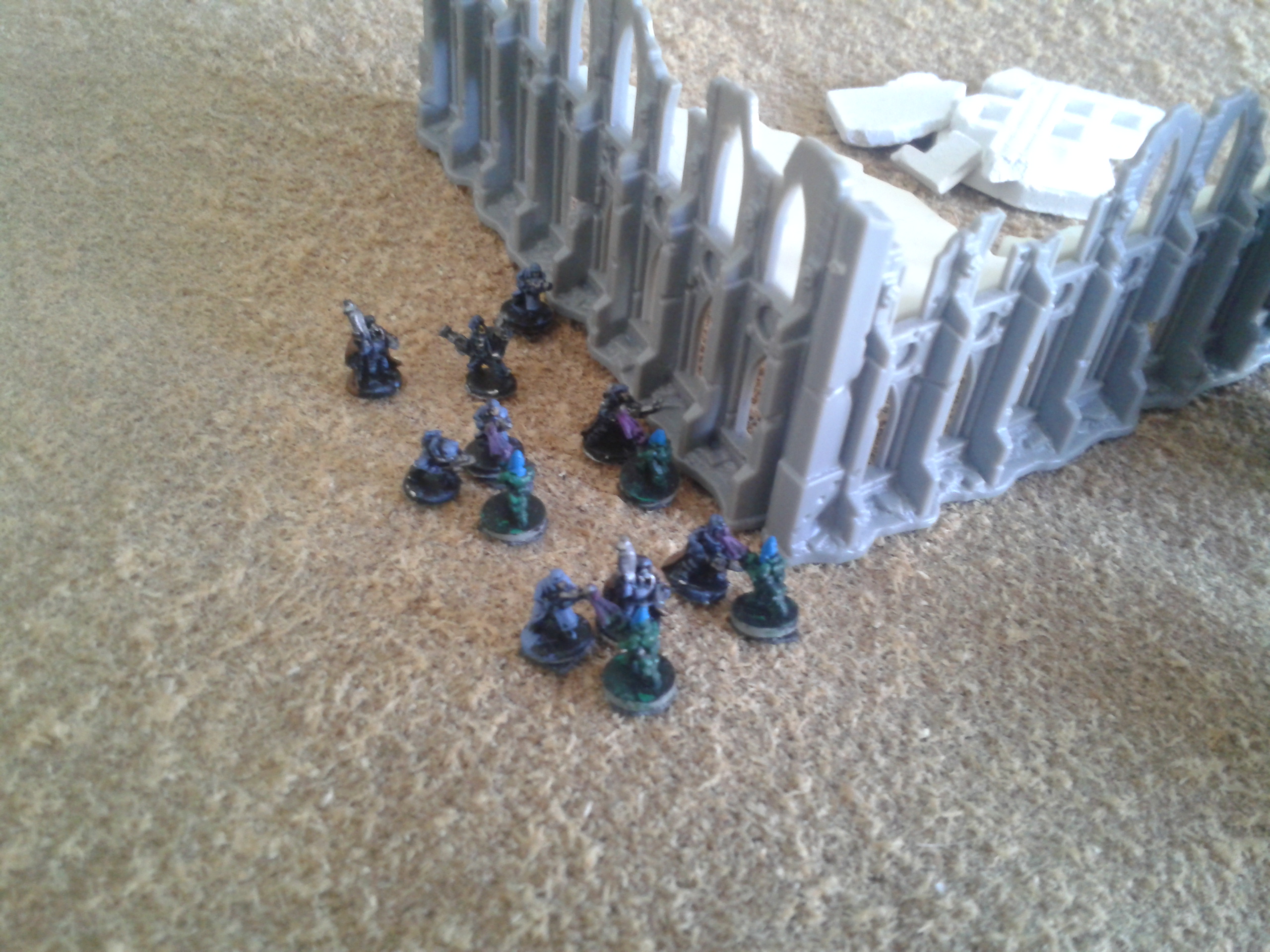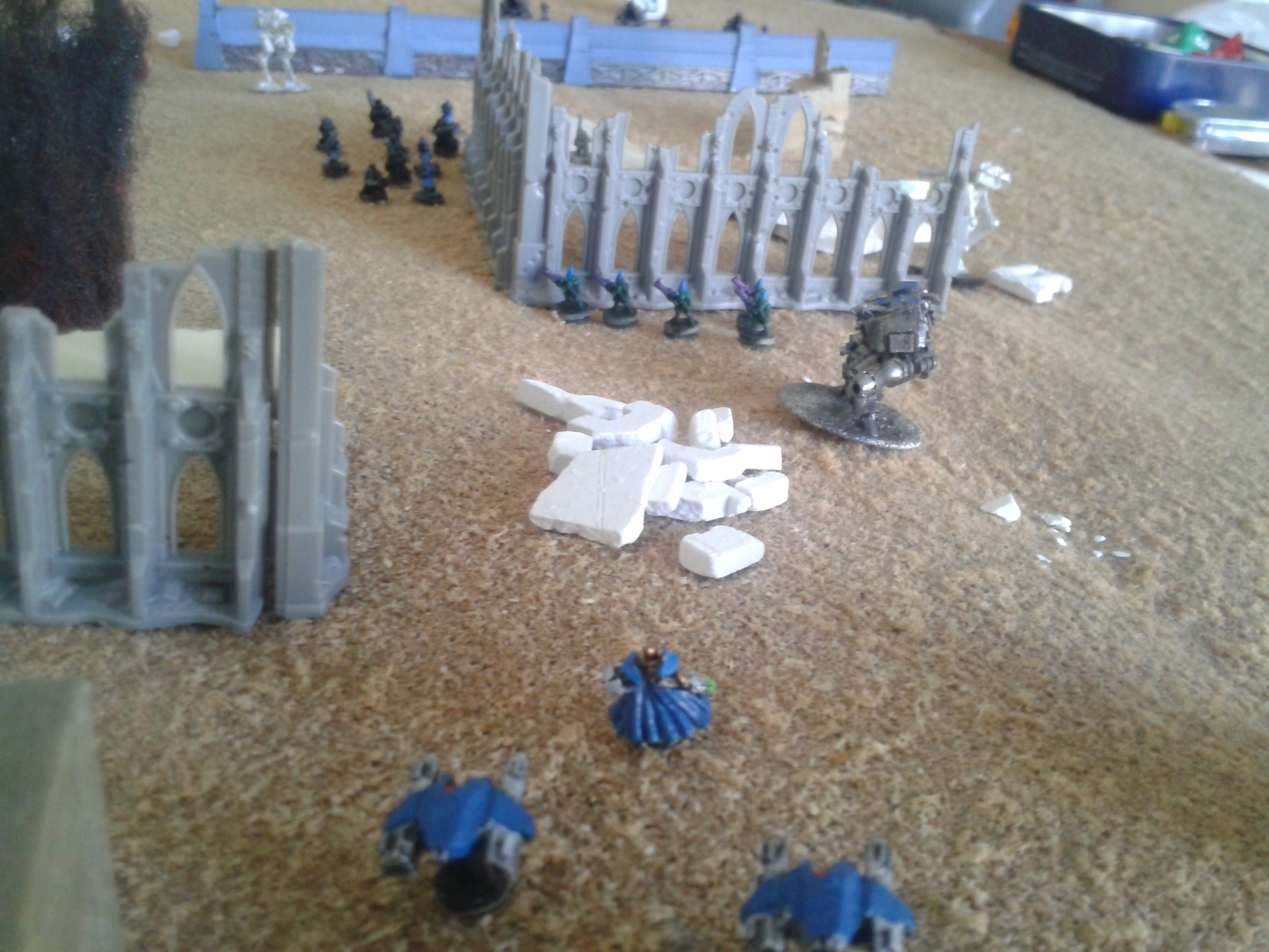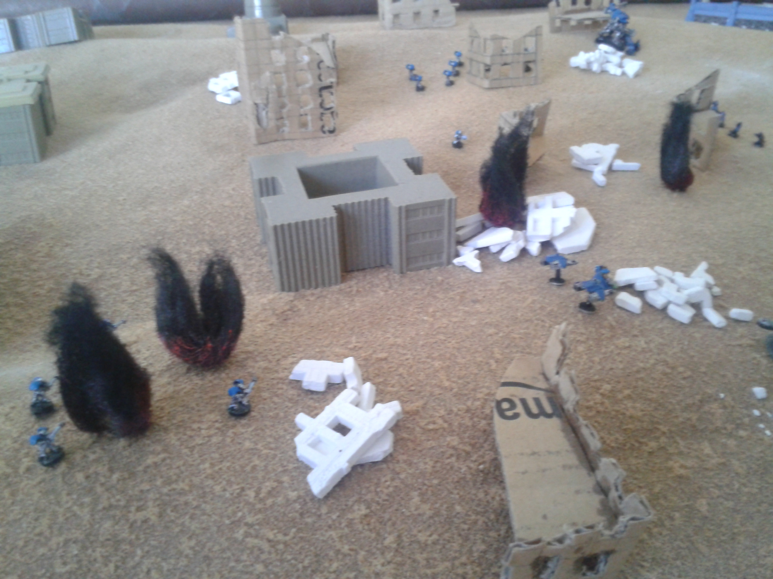 The earthshakers once again fire, this time at the Vanguard squad. The shots both miss, but strike the building adjacent to them, destroying both it and two of the three elites. The survivor wisely chooses to flee, over the cheers of the battlecannon crews.