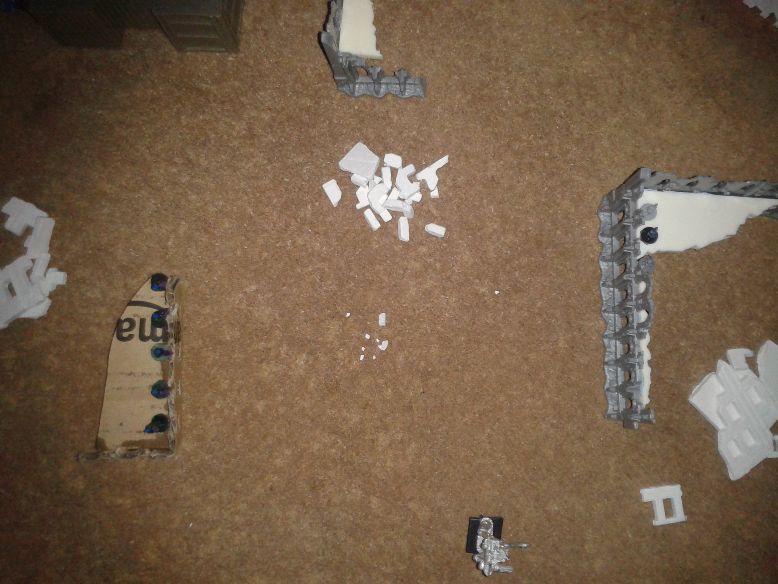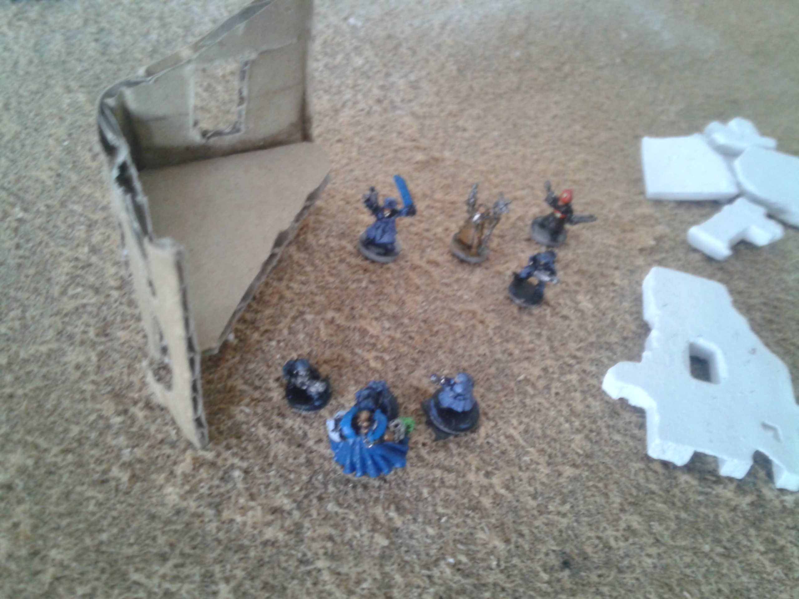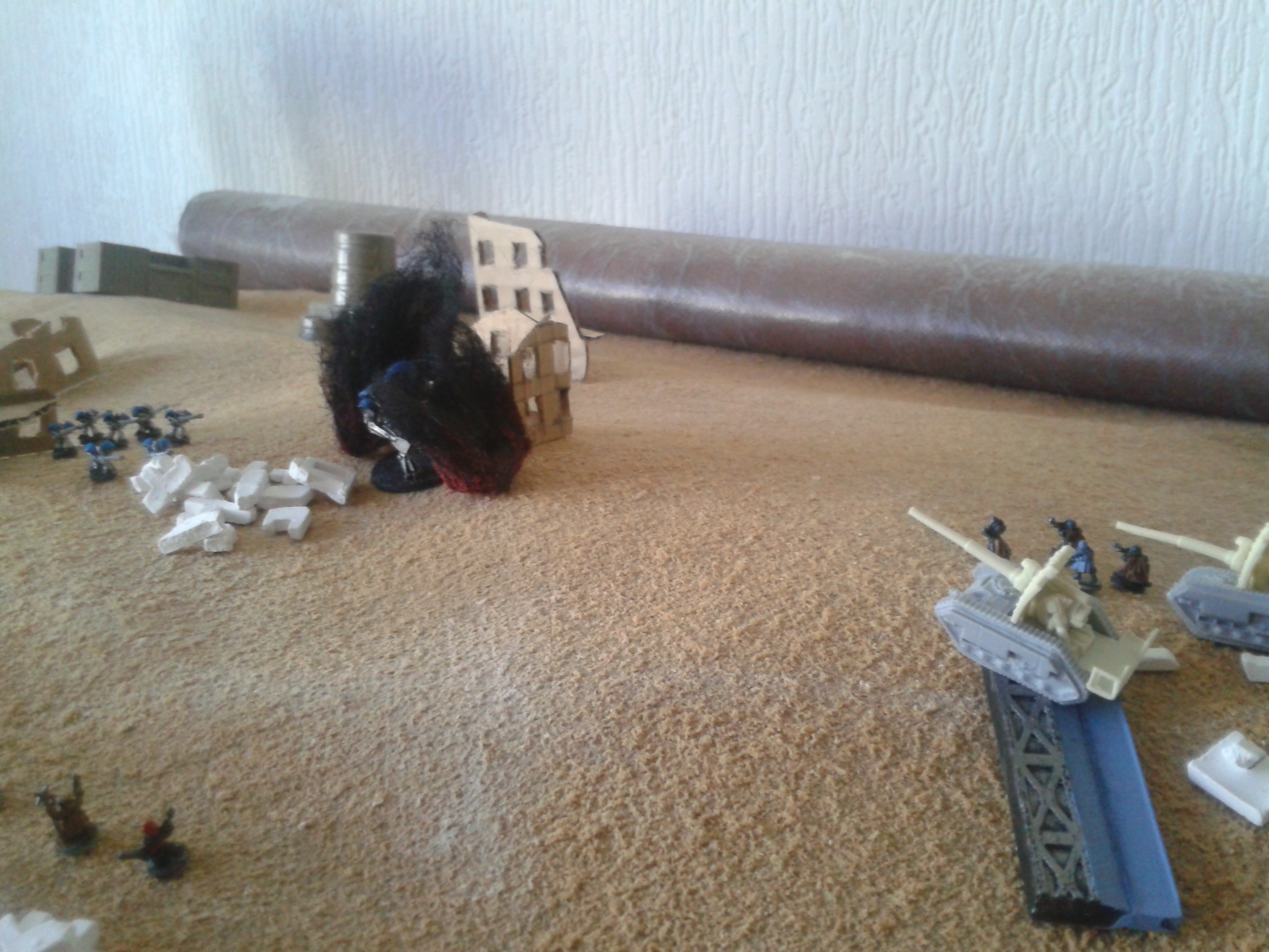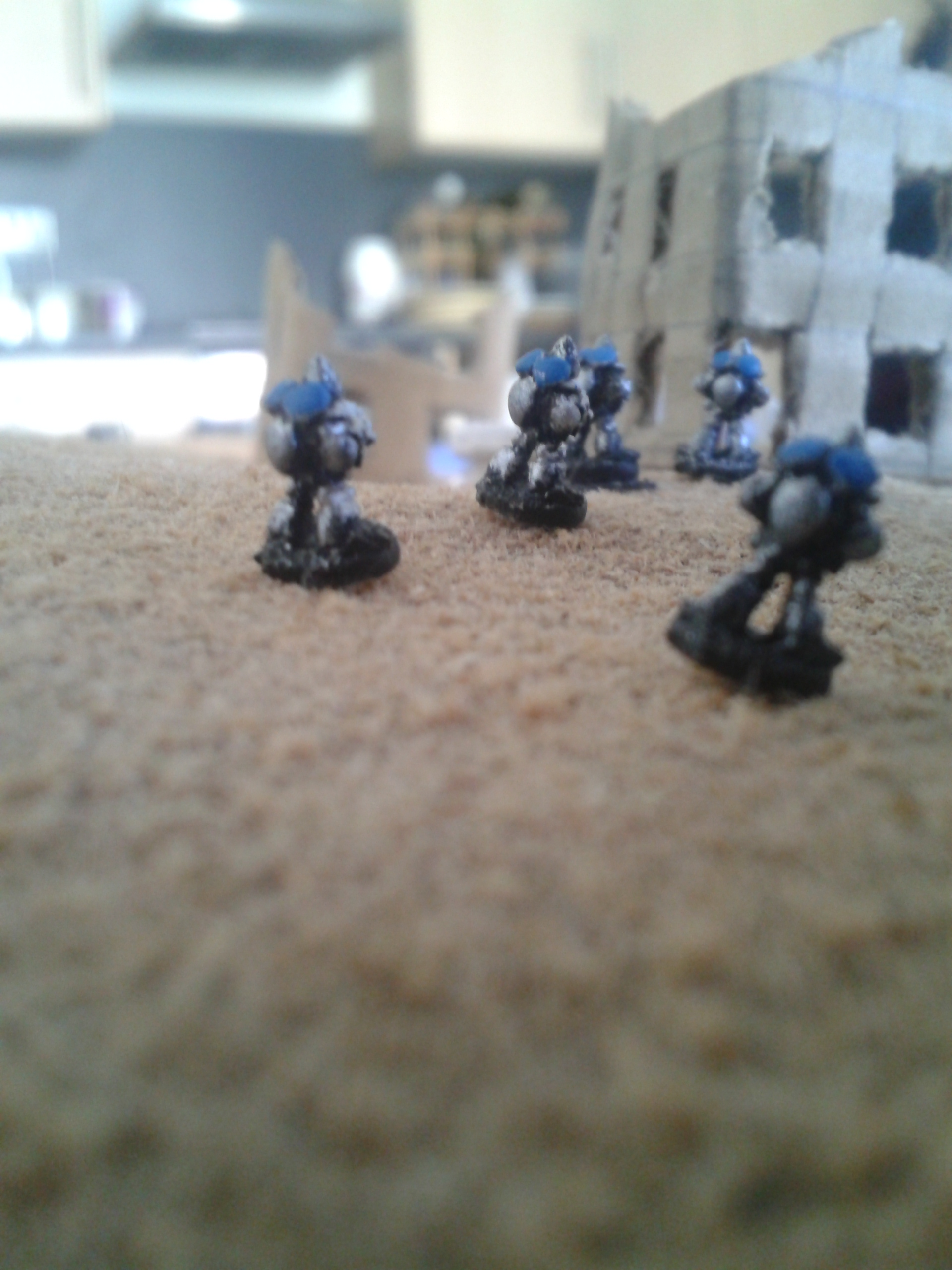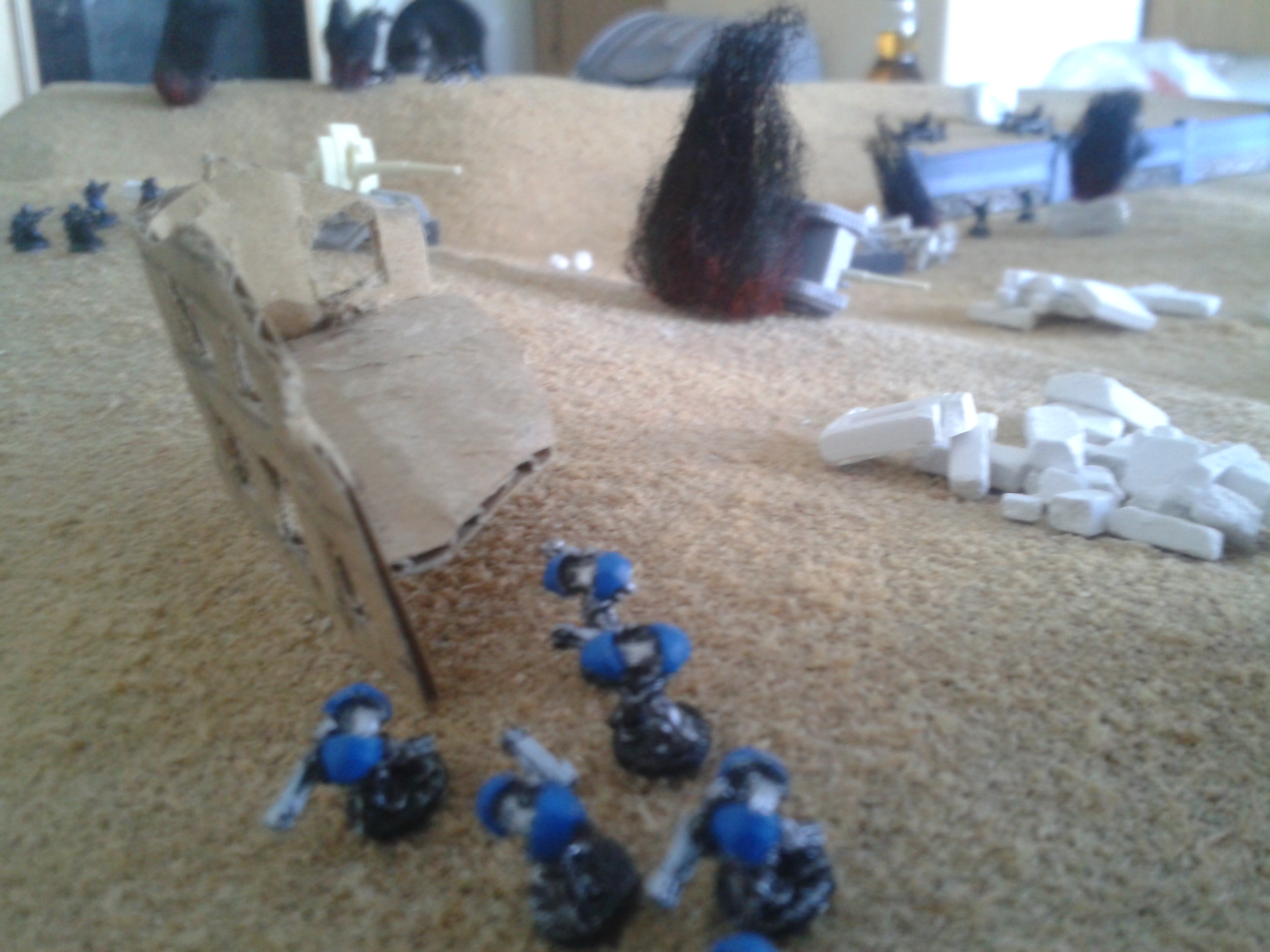 The earthshakers once again fire, this time at the Vanguard squad. The shots both miss, but strike the building adjacent to them, destroying both it and two of the three elites. The survivor wisely chooses to flee, over the cheers of the battlecannon crews.