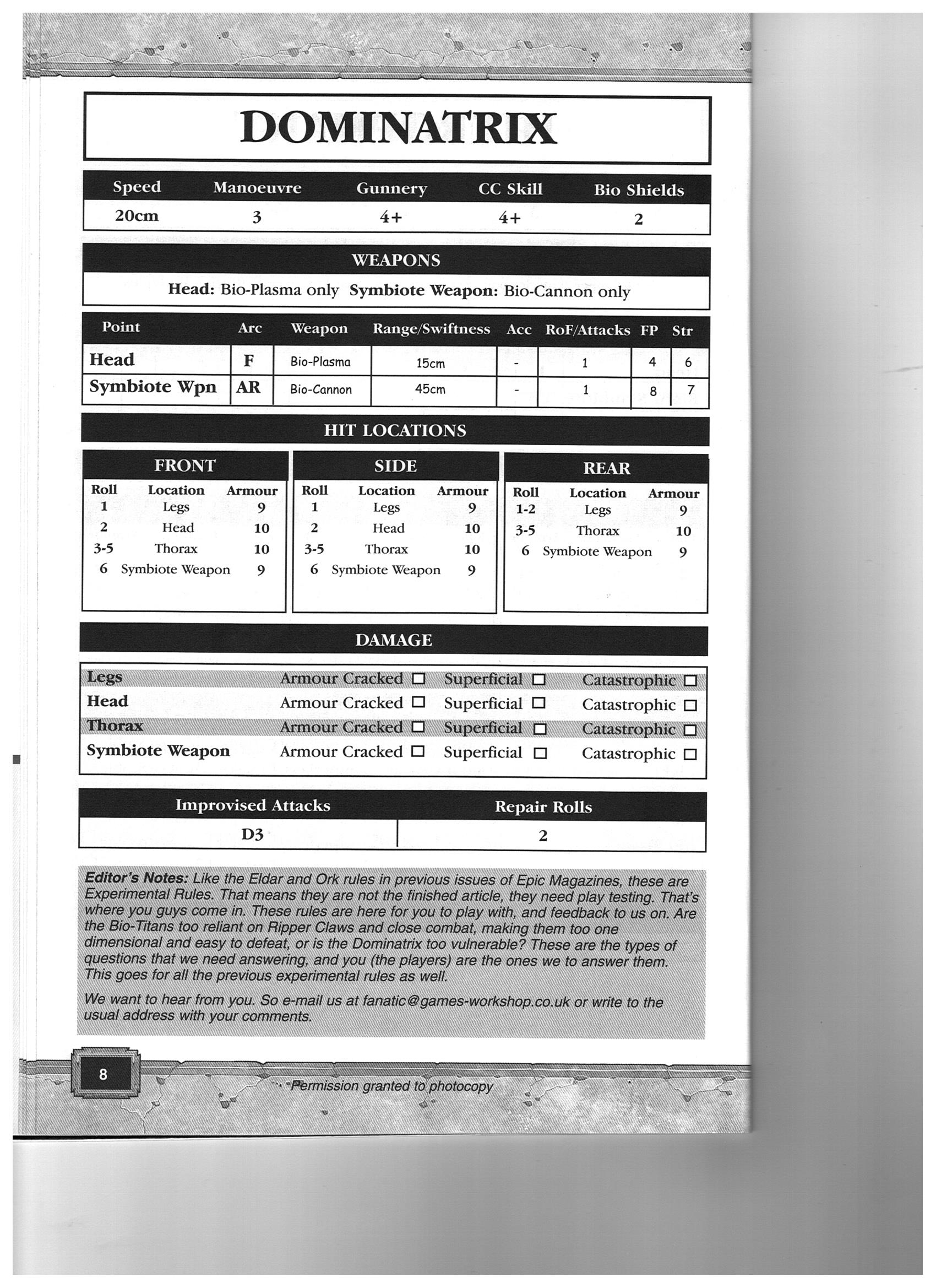 I've been looking at the Adeptus Titanicus II rules from various issues of the Epic 40,000 Magazine. The problem is, the rules for the Tyranids which were available as a PDF download only have the rules - the actual data cards for the Heirophant, Heirodule and Dominatrix aren't included.