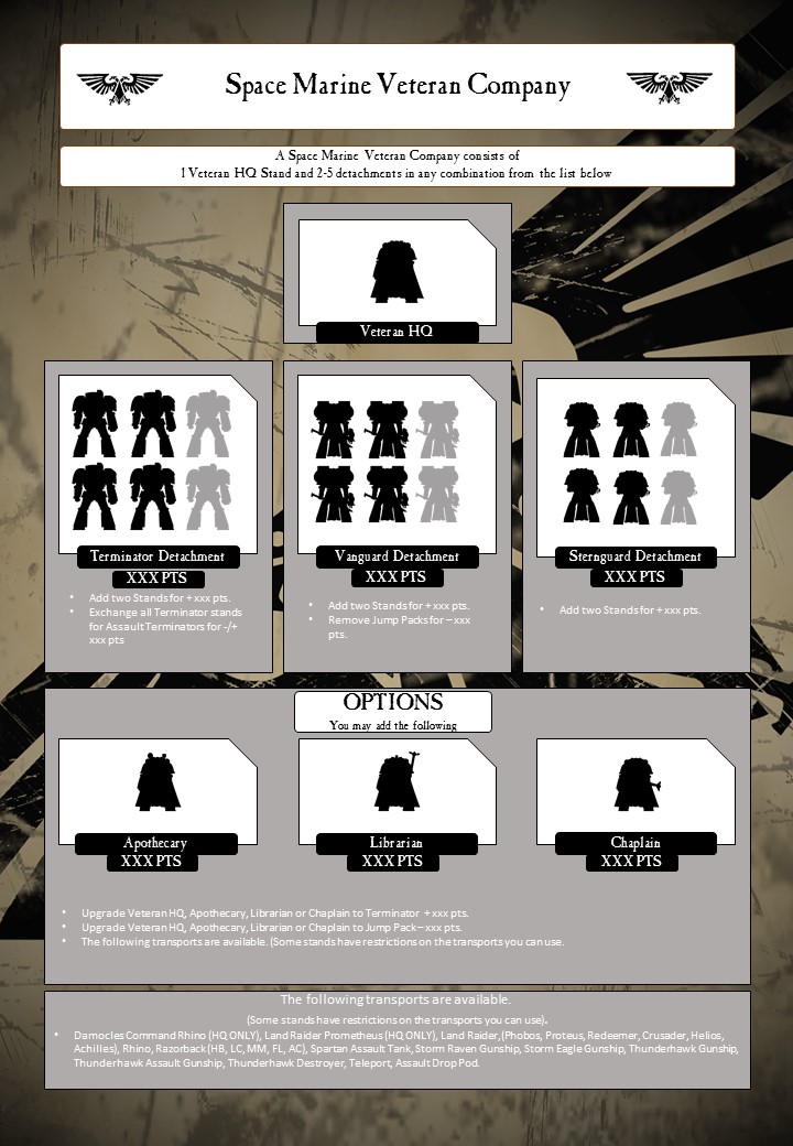 Version 0.1 DRAFT of a Veteran company layout. I understand they are still WIP but I wanted to have a go at it as it seemed quite overwhelming when I first looked at it. I think it works, it's a little prettier but isn't as efficient in space as yours for the final doc as each company takes a page. Hope this gives you something to work with and any changes you want let me know or if you just want to stay with the tabled versions that's fine. I added Jump pack for the HQ and Terminator for the Apothecary, didn't know if this was intentional or accidental either way let me know