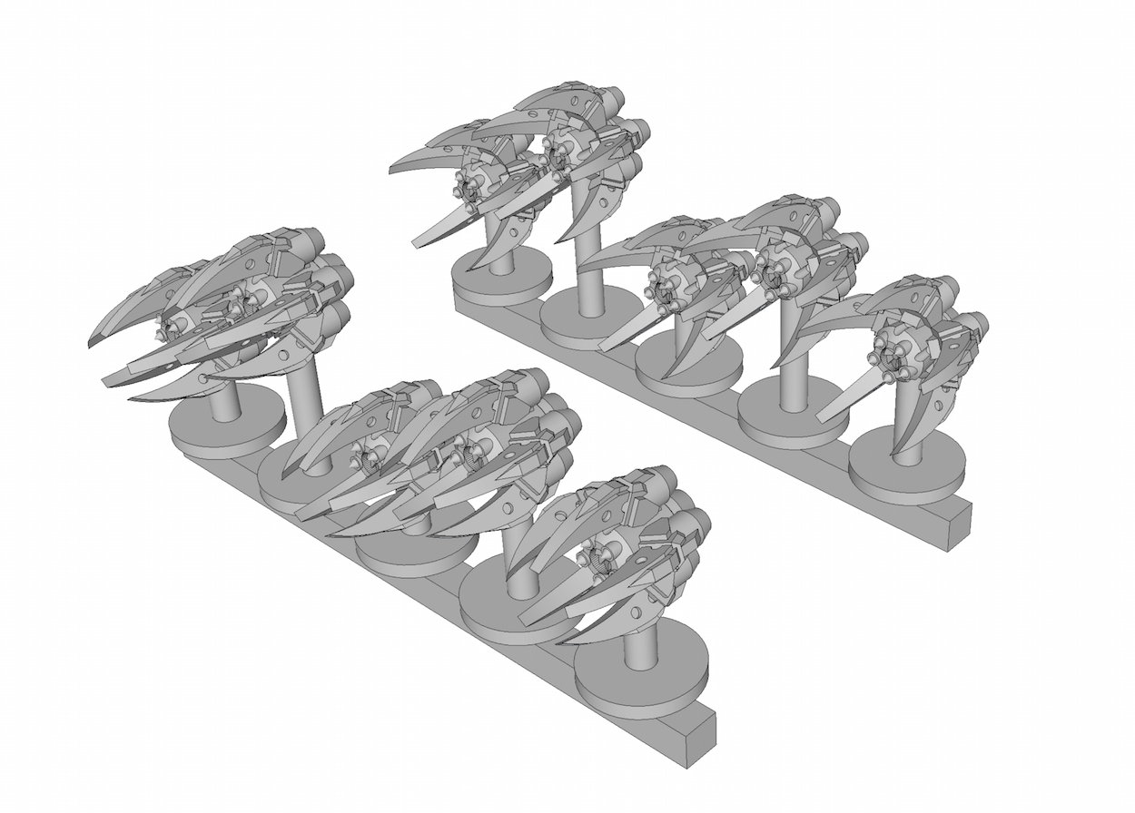 DestroyersThe smallest space ships of the Novan Elites that are capable of interplanetary travel. There are two hull variants: one carrier and a gunship. Not sure yet if the carrier will also be released, depends if there's any interest for it from the community. Each kit includes a hull and two turrets. These destroyers are about 3.7cm long, 1.6cm wide, and 1.8cm tall: