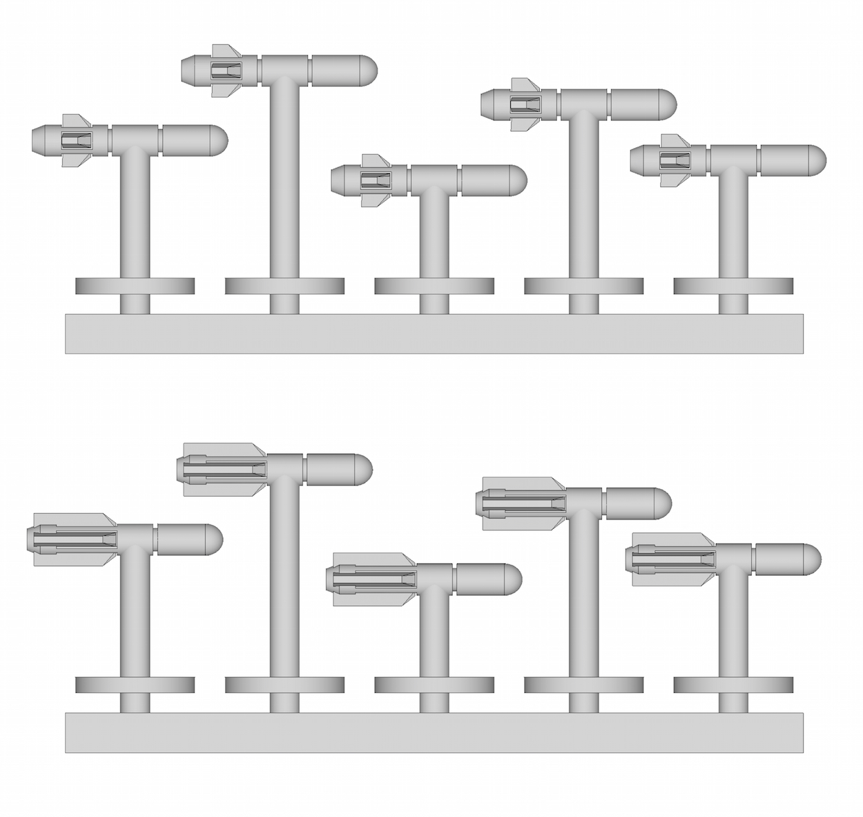 StationsAt the moment we've got two variants, one armed with weapon batteries, another one with launch bays. The stations both have a diameter of about 5.5cm and are 3.5cm tall. Each station consists of a 'hull' part and 8 separate turrets (4 on top, 4 at the bottom):