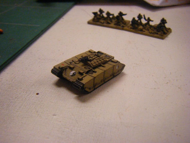 I under coat in Chaos black. Then i give a base coat of Graveyard Earth. Followed by Desert Yellow. With a dry brush of Scorched brown on the treads.
