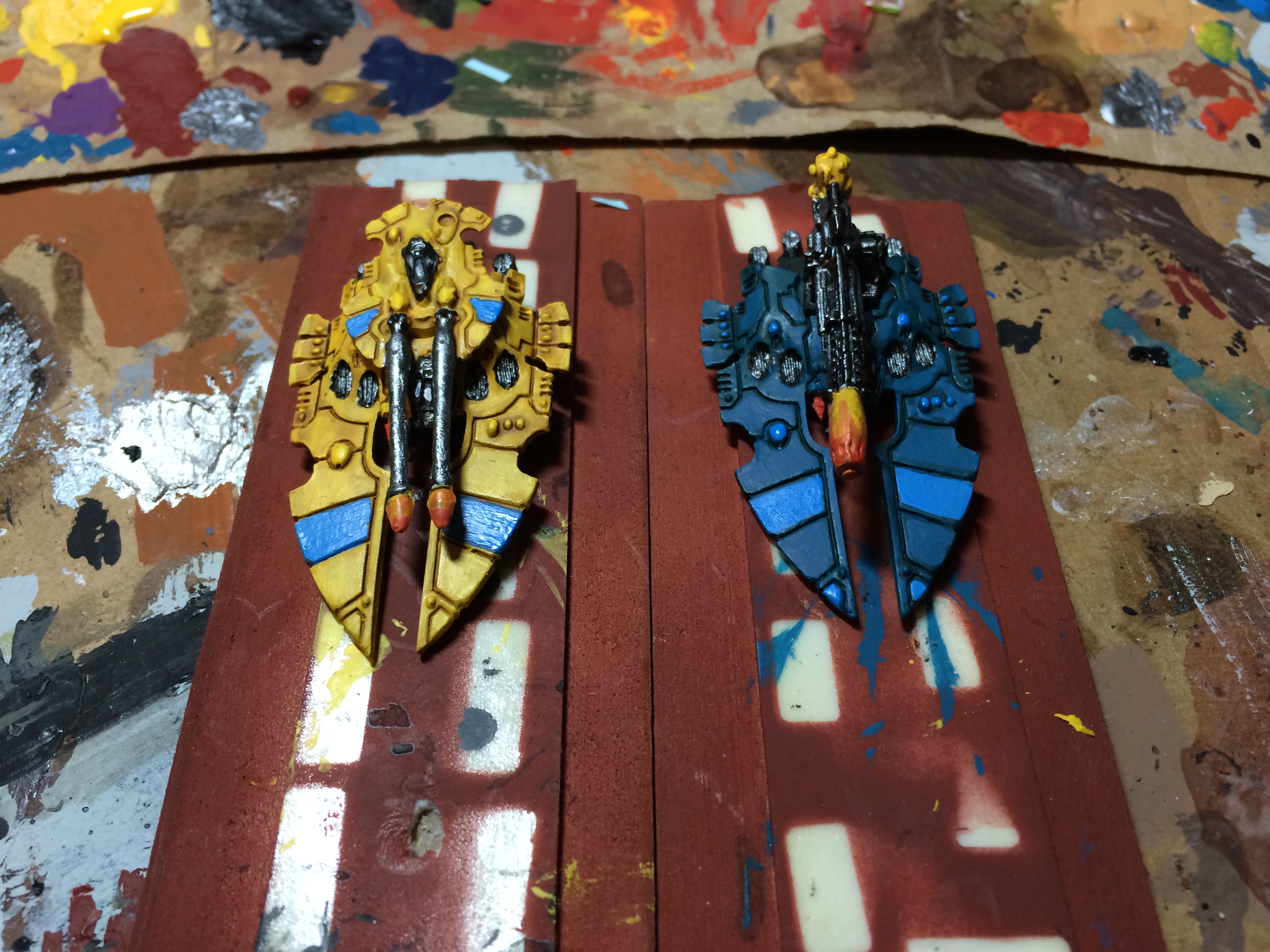 okay its been a while I got sidetracked by my UCM for Dropzone Commander, 1500pts are complete so now i am able to start my Eldar. I finally got some miniature colour schemes down and painted a few war engines, Cobra and Scorpion to be specific. I have five more engines to paint. 2 Void spinners, 1 Cobra and 2 Scorpions. So the Biel tan colour scheme will be yellow with some blue. I used Vallejo paints Flat yellow, army painter soft wash and Azure Blue. the guns were washed with old GW paint called hobgoblin orange and black is GW black, along with bolt gun metal for the weapons and engines. Enjoy