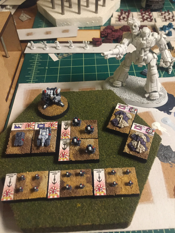 So I followed my whim and began doing a little groundwork for something with a definite anime flavor. These are the first units of the JGSDF National Readiness Force, preparing to repel an attack on the city of Megasaki in the year 21XX. Tanks are from NCE via shapeways and have a really sharp “anime” look. Infantry as always is from O8. I aimed for soft colors with a cel shaded look to the edging. I think it works!