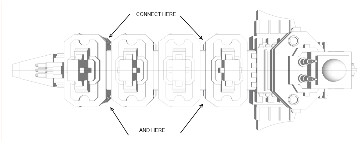 My only suggestion would be that since two modules, for lack of a better word, represent a single bay on the hull in BFG world (it being a CL after all) I'd connect them a bit. Perhaps on the upper and lower edges of both have it go straight across instead of cutting in. It'll reduce a bit of the tendency of the model to look bulbous at a distance I expect. Being an original design I'd love to see this on a Shapeways store too.