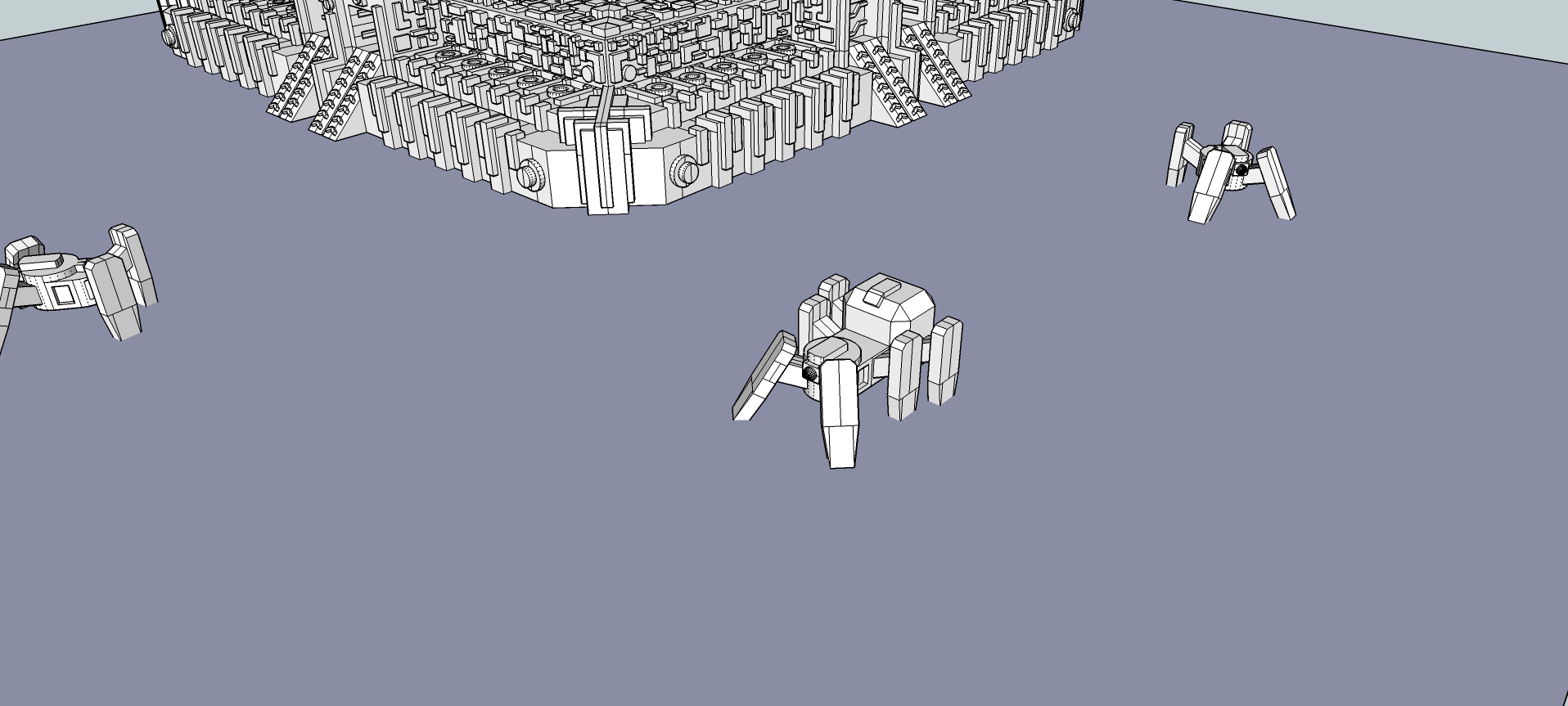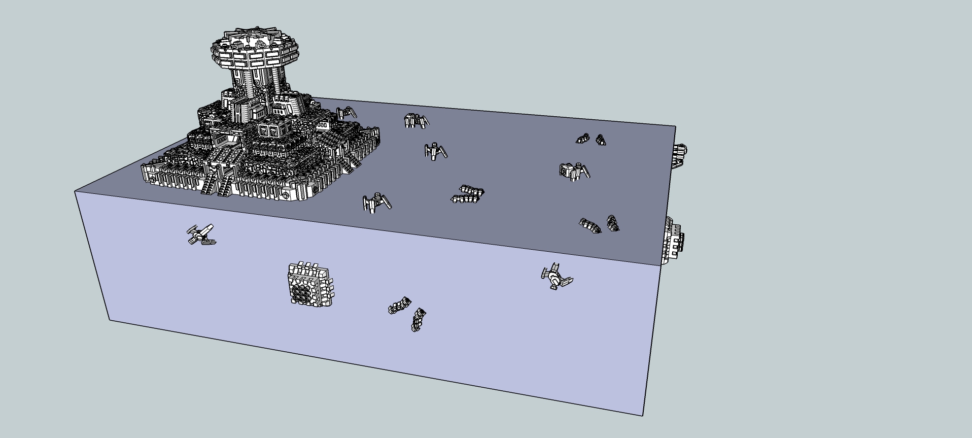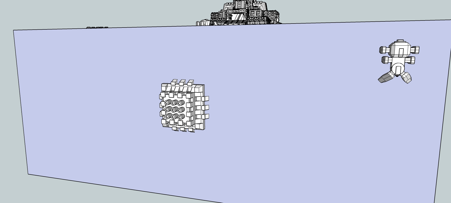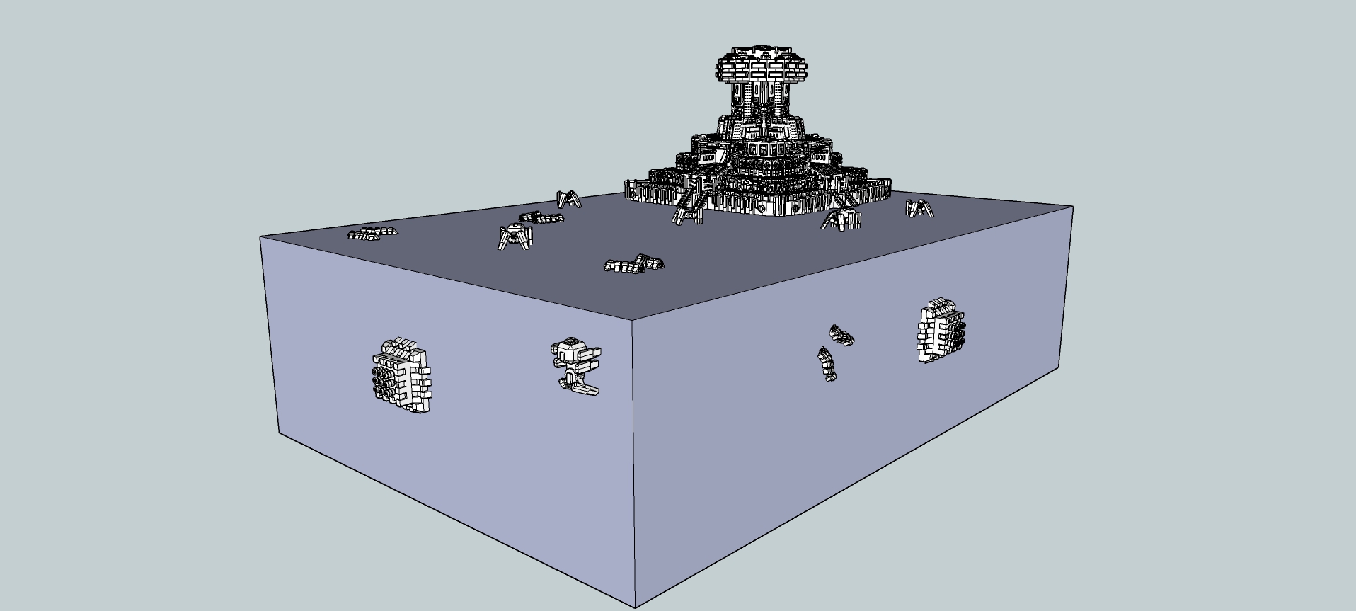 Now the model! I designed it as a series of components (namely the rig, engines and various drones), to be added to a core of Styrofoam “asteroid” roughly 15cm x 10cm x 5 cm. In the pictures, the purple solid stands in place of the asteroid slice.