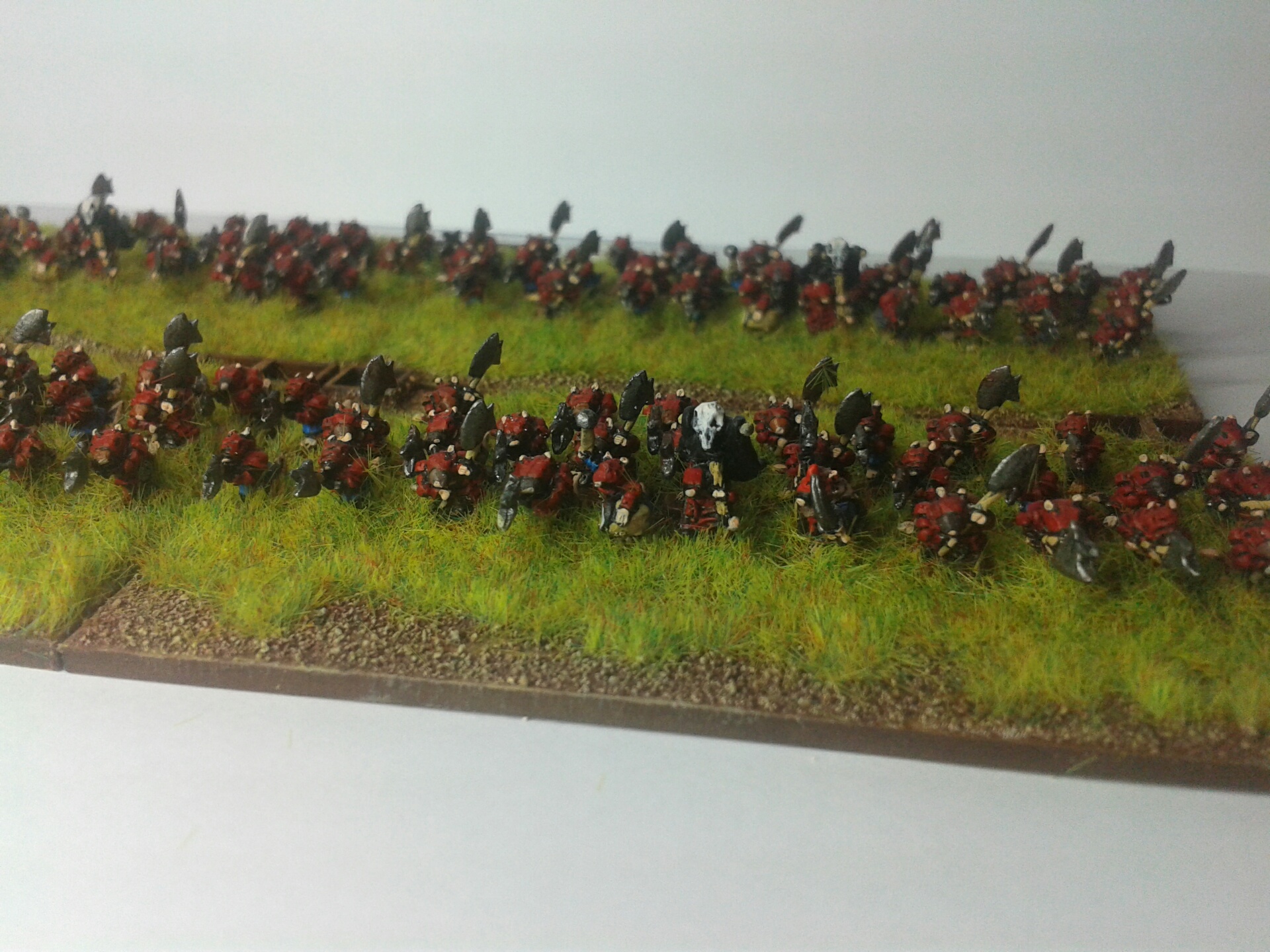 I am working on my own rules. Base size 80 x 50 mm. I like the large base format makes armies look like armies.