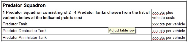 @mattman (mostly) Actually, there could a an actual problem with mixed formations, as well as formations with variable sizes, as far as the Points Formula is concerned. [This does not affect NEGold values.] Well, perhaps "problem" is too strong of a word. It will make figuring out the final cost of the detachment more complicated. While the adjustments for Chain-of-Command, Morale, and formation type can be applied before the total number of models in the detachment is known, Break Point cannot be adjusted for until then. This is because the value of each model in a detachment is reduced by the amount that the detachment's BP is below 100%. This adjustment is always done after all other modifiers. To illustrate: _ Example A: A Shadowsword has only one model in it's detachment, thus it's value is at 100%. _ Example B: A NEGold Terminator Support Formation has four Terminator stands and two Land Raiders for a total of six models. It has a BP of 3, and thus all of the models in this formation have their value reduced by 50%. _ Example C: A NEGold Land Raider Support formation has three Land Raiders with a BP of 2. The value of each model is multiplied by 2/3 (IE, reduced by 1/3) as a result. _ Example D: A NEGold Land Raider Company has three detachments each with three tanks plus one Command tank for ten models and a BP of 5. The value of each model in this detachment is reduced by 50%.