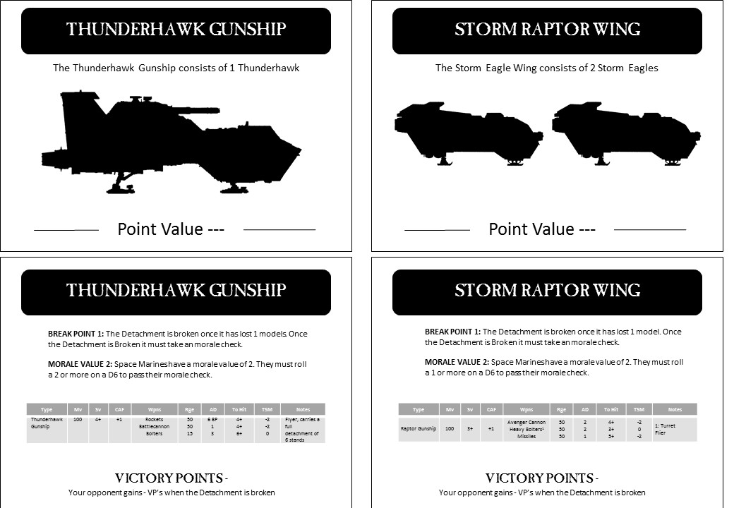 1) Storm Eagle - Flyer, carries 4 stands, probably 4+ Save armed with Anti personnel Rockets, Launcher (BP2?) and a twin heavy bolter.