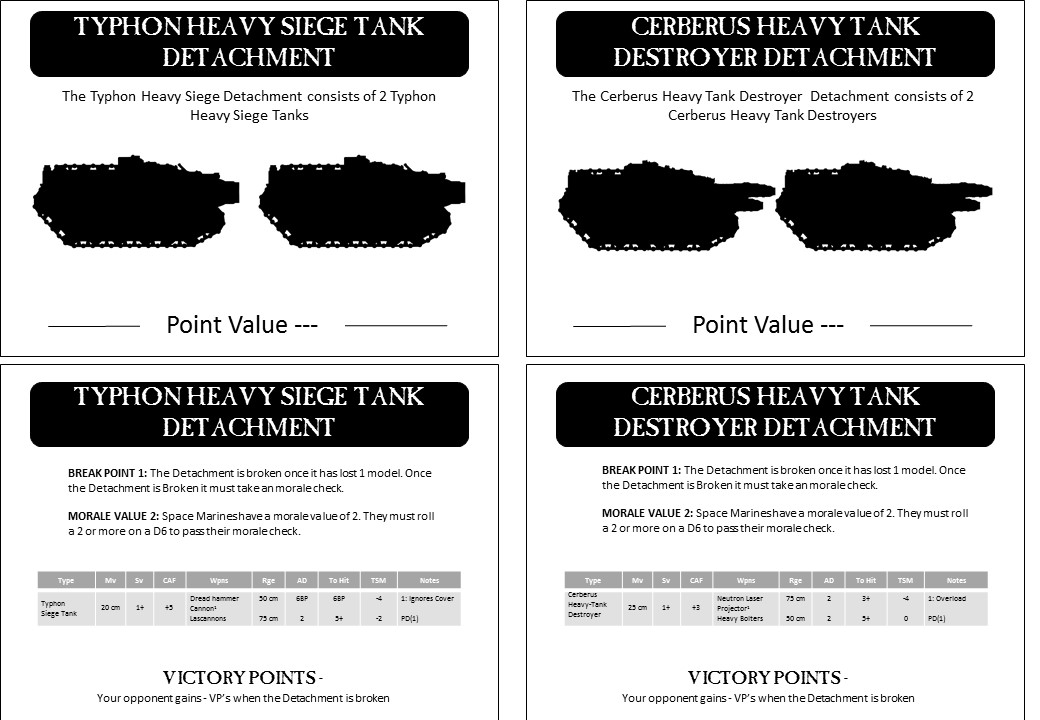 2) Spartan assault tank - Heavy Tank (think Land Raider on Steroids), 2 sponson Quad Lascannons, and a twin heavy bolter, carries 5 stands.
