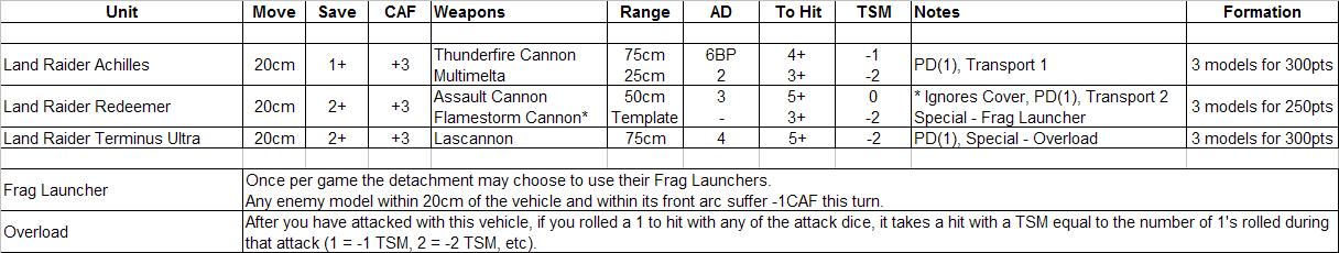 The Redeemer is an alternative transport option like the Crusader. It mounts a twin linked assault cannon (used standard stats) and two flamestorm cannons. The flamestorm is a massive flamer that has good anti armour properties. Rather than have two flamer shots, I decided to just treat them as a single shot with good to hit and a decent TSM, if I did them separately I would most probably have them as 5+ to hit and -1 TSM. The Redeemer (and Crusader) are also armed with Frag Launchers which are meant to fire a load of frag grenades into the enemy when the occupants dismount to assault. To represent this I gave them the ability to disrupt some nearby enemy models in combat. In 40k the normal land raider and Redeemer are of similar points, so stuck with 250 for a detachment since you sacrifice the long range firepower for more short range options.