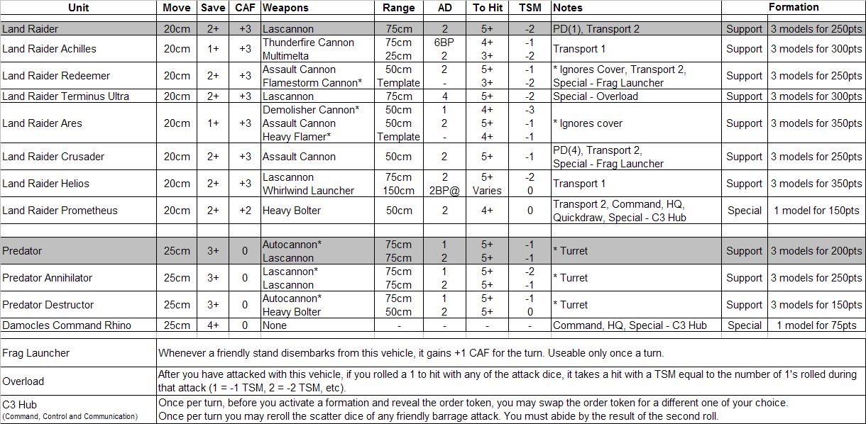 I have added the original Land Raider and Predator stats (coloured grey) to give some comparison to the new units.