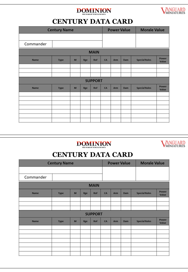 I have also attached a example of a Century which will contribute one activation. As you can see at 300 Power the game will involve many Centuries and is truly mass battle. I've also included a blank to help get you started