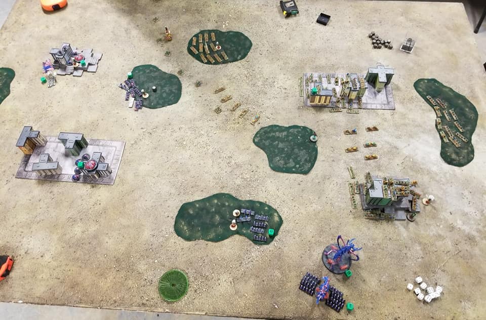 Not a good match up playing against necrons with a drop list but i really wanted to try it and i wanted to use a hydraphant. The necrons ended out coming out on top 2-0 end of turn 3, blitz and BTS. The pylons got a lucky shot on the hydraphant turn two, 3 wounds plus 2 criticals, one was a second 6... dead titan. This is a brutal critical. The attack swarms did really well and are well worth the points. The big issue was the Necron initiated the majority of the assaults so the gaunt rule only worked once. There were a lot of assault actions but the nids were on the losing the majority of the time. My opponent used the monoliths to screen the troops then initiated assaults using the infantry. The monoliths would make the saves and a lot of gaunts would die. Skimmers plus FF assault infantry make for a hard fight for the nids.