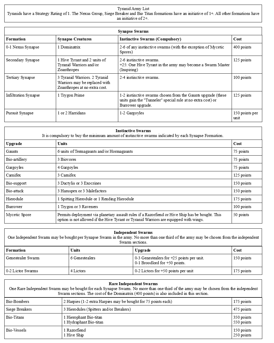 I wanted to give some feedback since I see one problem with the list. It's with how the brood creatures behave. From a fluff point it seems like one should just throw them right into the frayin epic assaults. But in gaming terms I find that you don't want to. The hormagaunts are mostly a liability and also the termagaunts but to a somewhat lesser degree in assaults. That's because they die in drows due to not having any save. This gives the opponent a lot of kills in the resolution phase. I find that an unupgraded swarm/only gaunts has very little use for this reason and have a rather hard time winning assaults.