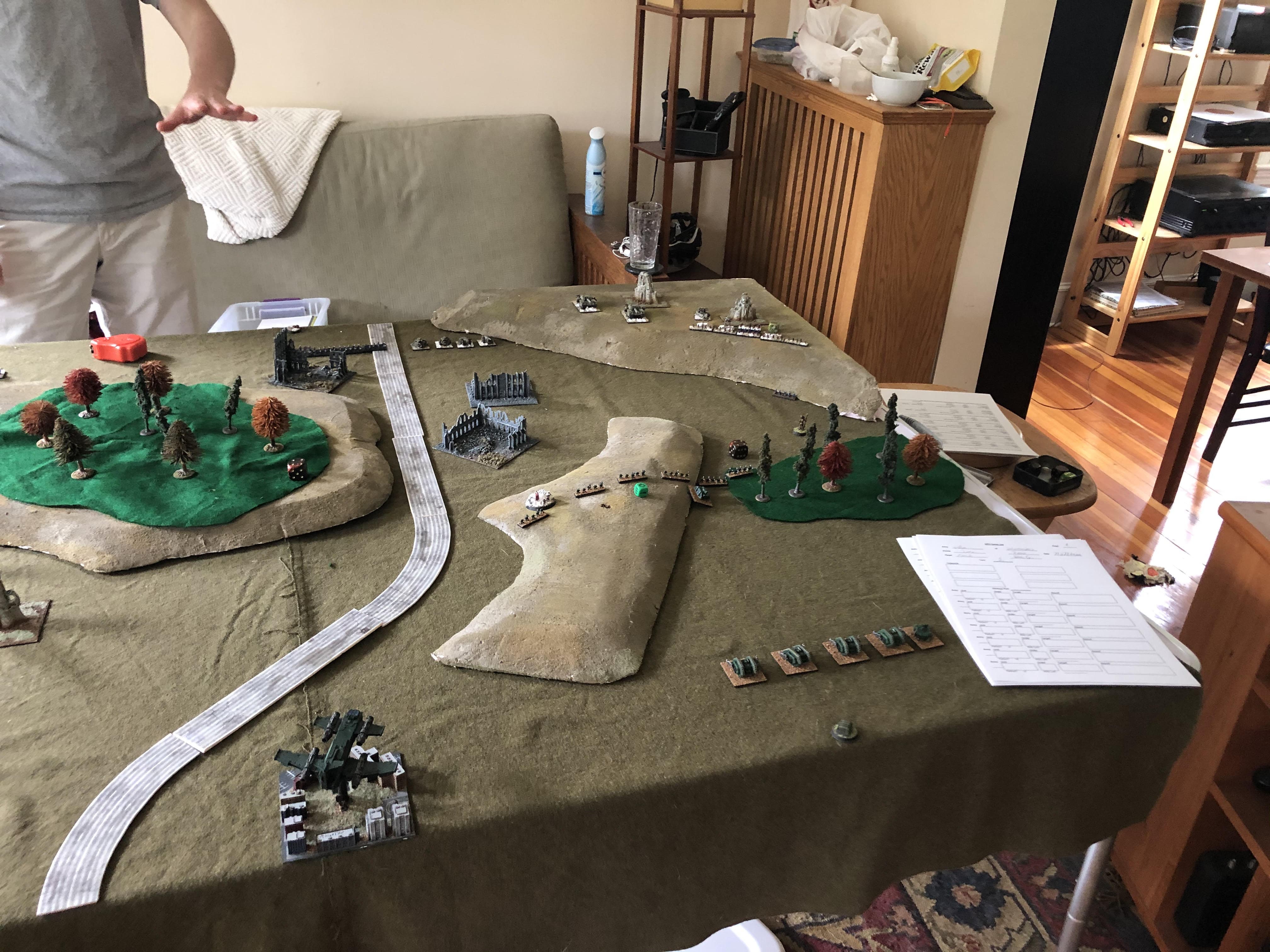 Turn 1, Salamander assault unit moved up, to occupy forest. Crisis suits countered and killed 3. Heavy battlesuits moved up and attacked the scout formation, killing 2. Thunderbolts came in and shot up some breachers, then got shot down by skyray/riptide fire. On the left flank, stormsurges and heavy battlesuits put damage into the devastators and broke them.