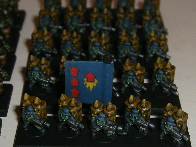 I'm not sure what the new "fluff" says but back in SM1, the closest they had to Kommandoz was StormBoyz. So what we did for clan purposes, we put Kommandoz, StormBoyz and RokkitBoys[StormBoyz with jump packs] in the same catagory. So intern the only Clan that can't have any of those is SnakeBitez. I don't know how long you have been playing Epic. But in SM1, the Ork sprue had StormBoyz but they had no jump packs. While in SM2 they released an Ork sprue with both Kommandoz and StormBoyz w/Jump Packs. We later called RokkitBoyz ... Here is a pic of one of my StormBoyz Mobs from SM1 [no jump packs] ...