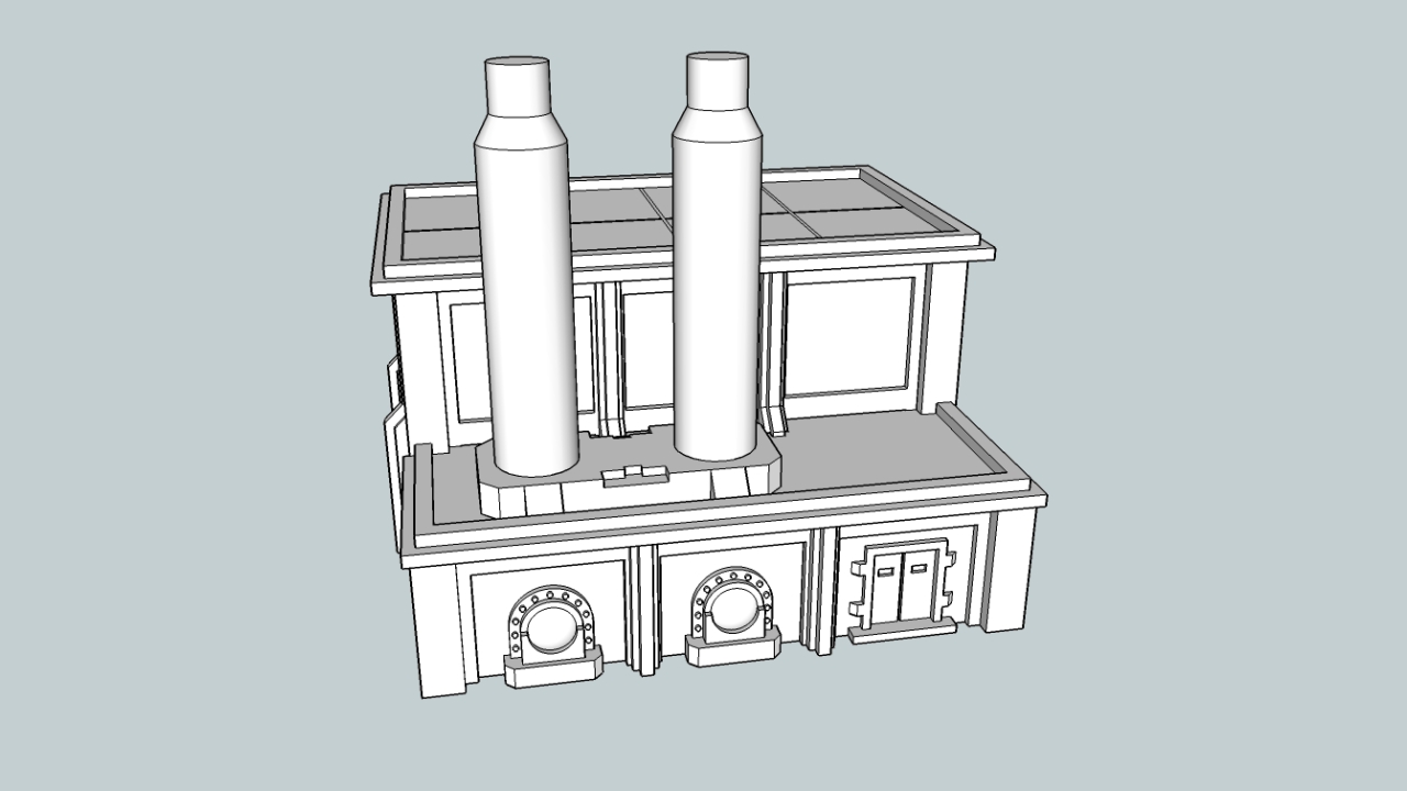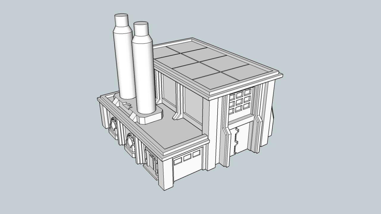 Simple mockups for an Epic base and Rhino, for scale. The footprint is the same as a Medium building (80x80 mm). I think I've got it down to two main pieces, plus the pipes which will need to be done separately and would come on their own sprue. Might go back and tone it down with the skulls a bit - this may be too much even for me